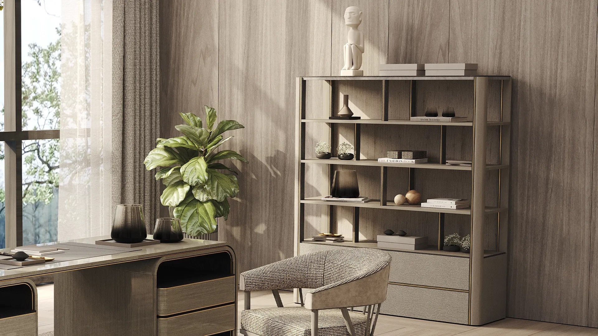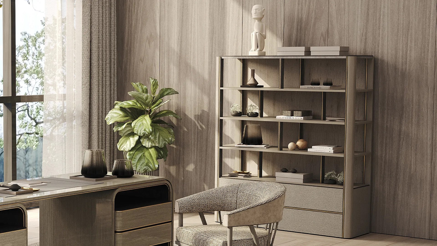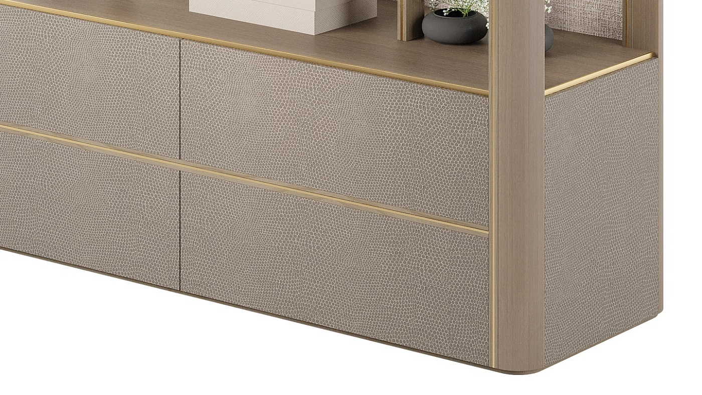 Этот совершенно новый книжный шкаф, являющийся последним дополнением к нашему семейству мебели KENT, пользующемуся наибольшими продажами, продолжает эстетику коллекции с чистыми линиями, открытыми деревянными полками и выдвижными ящиками без ручек, отделанными текстурированной искусственной кожей.