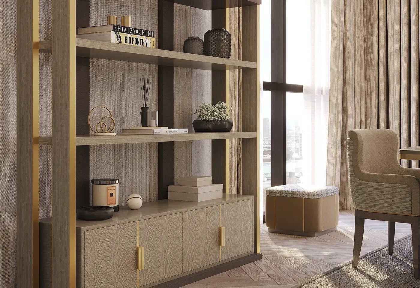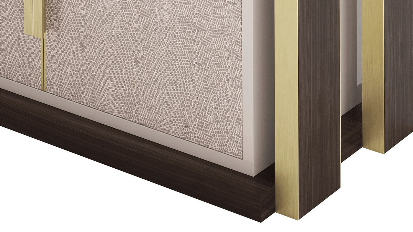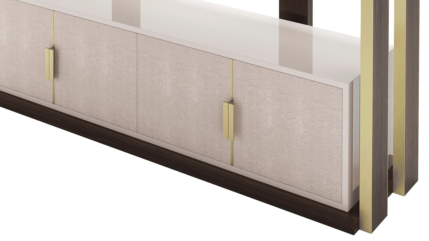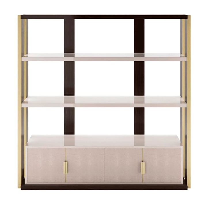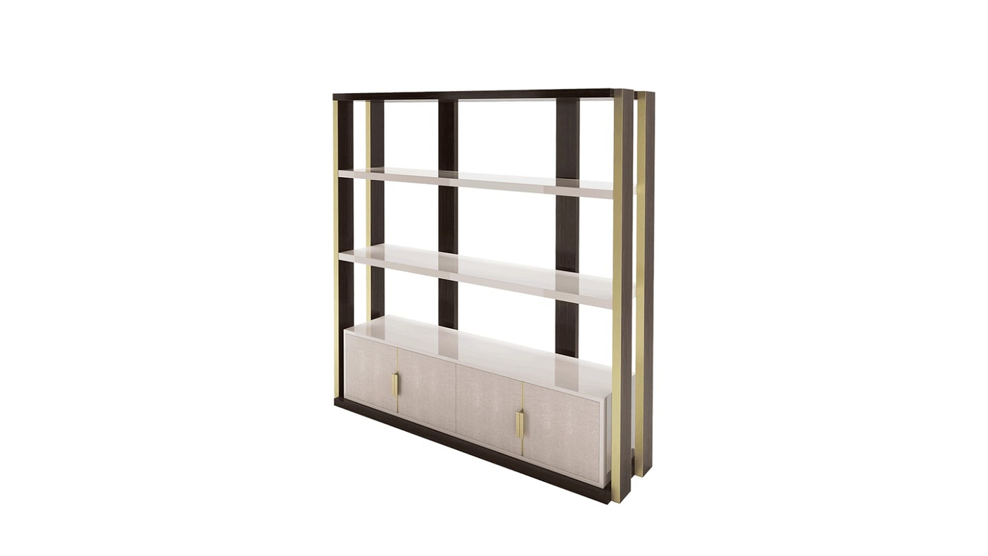 Эффектный книжный шкаф NAPIER сочетает в себе угловатый силуэт и максималистское сочетание материалов. Каркас выполнен из шпона темного дерева с металлическими вставками, дверцы обтянуты кожей с ручками из матовой латуни, а открытые полки покрыты глянцевым лаком.