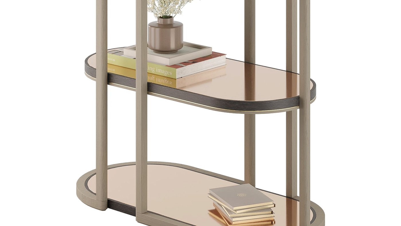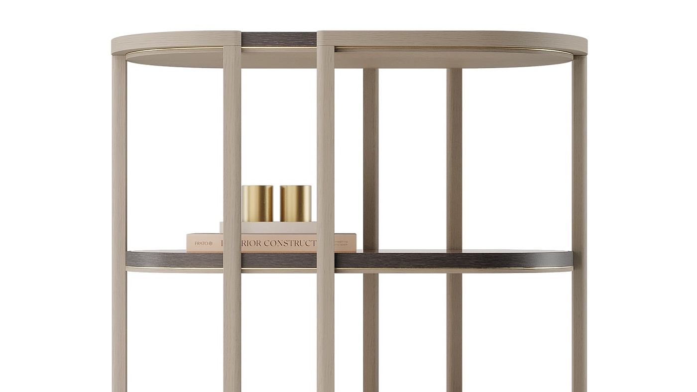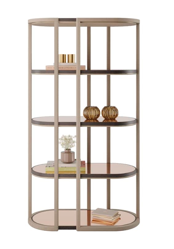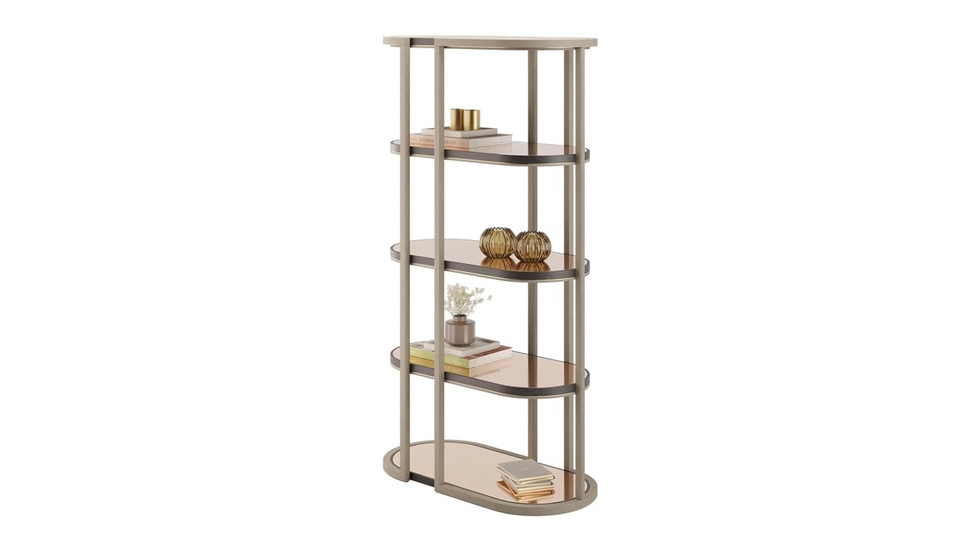Плавные изгибы определяют очертания скульптурного книжного шкафа OJAI с полками из шпона, заключенными в раму из блестящей матовой латуни. Используйте пару, чтобы создать эффектный центральный элемент, или один книжный шкаф для создания привлекательной отдельной витрины.