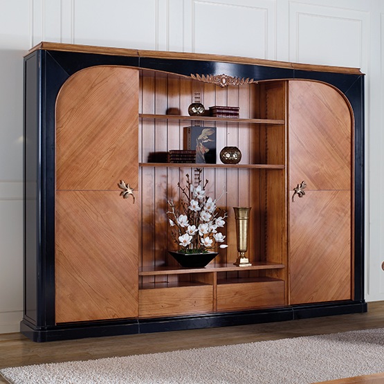 Вместительная стенка Gala AM Classic поможет вам при желании уйти от тотально коричневой меблировки, если вы выбрали для гостиной классику. К тому же чёрная «рамка» облегчает конструкцию, визуально уменьшает её. В этой модели прекрасно всё: и просторные закрытые секции, и грамотно скомпонованные открытые полки, и минимальный декор, и естественный рисунок красного дерева. Мастера португальского бренда не позволили себе отдохнуть на каком-либо элементе конструкции: шкаф совершенен, с какой стороны к нему ни подойди. От дерева исходит тепло ручной работы.