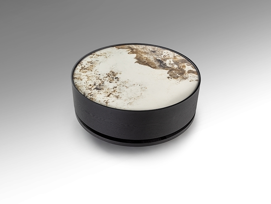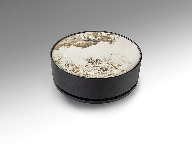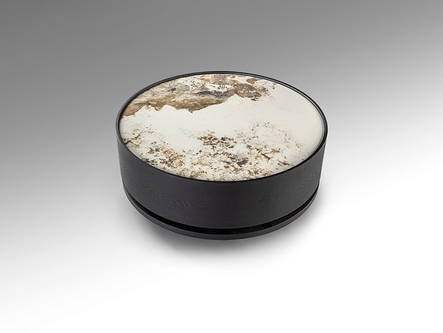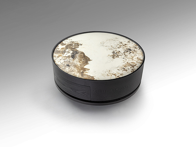 Вращающийся журнальный столик с ящиком на полозьях. Изготовлен из чёрной фанеры. Столешница из фарфора с отделкой из мрамора с прожилками.