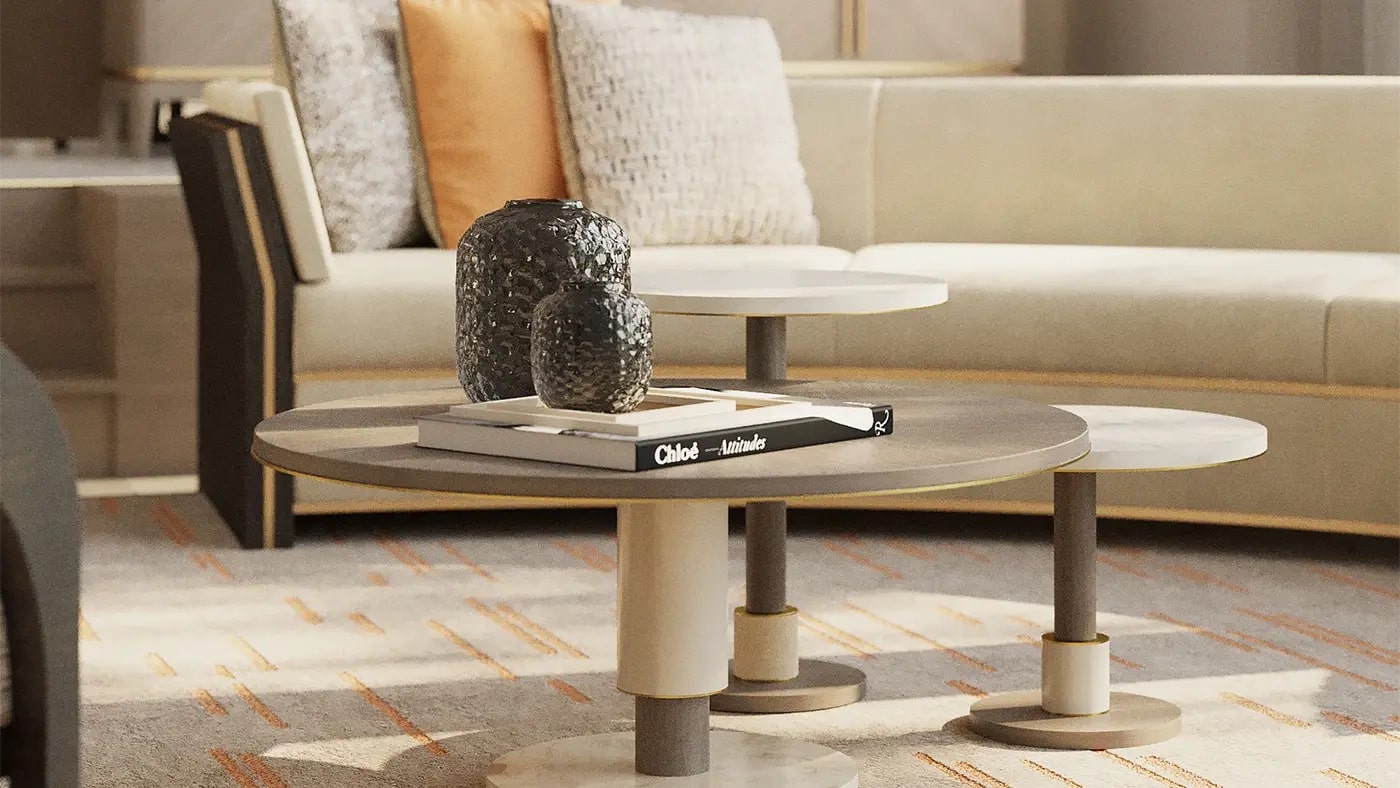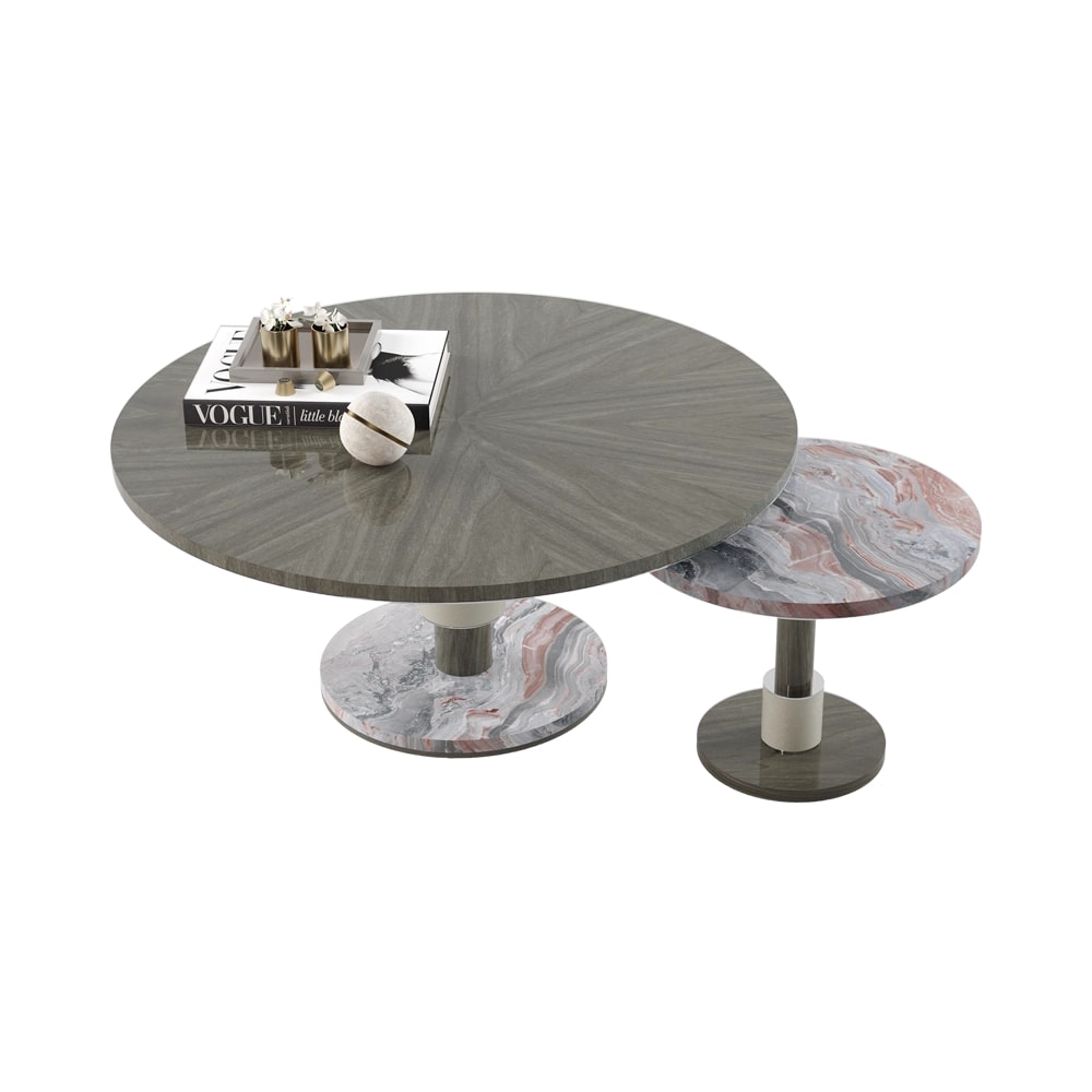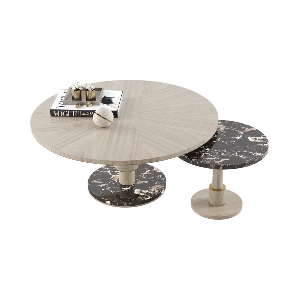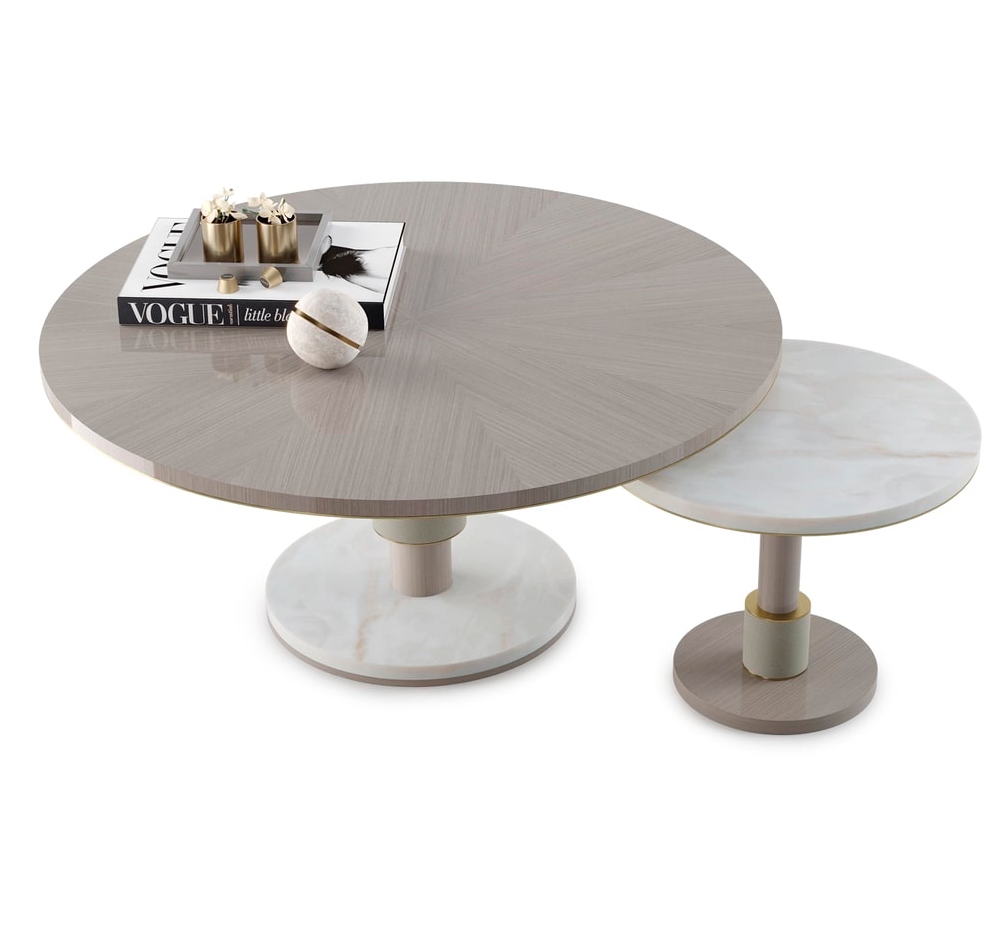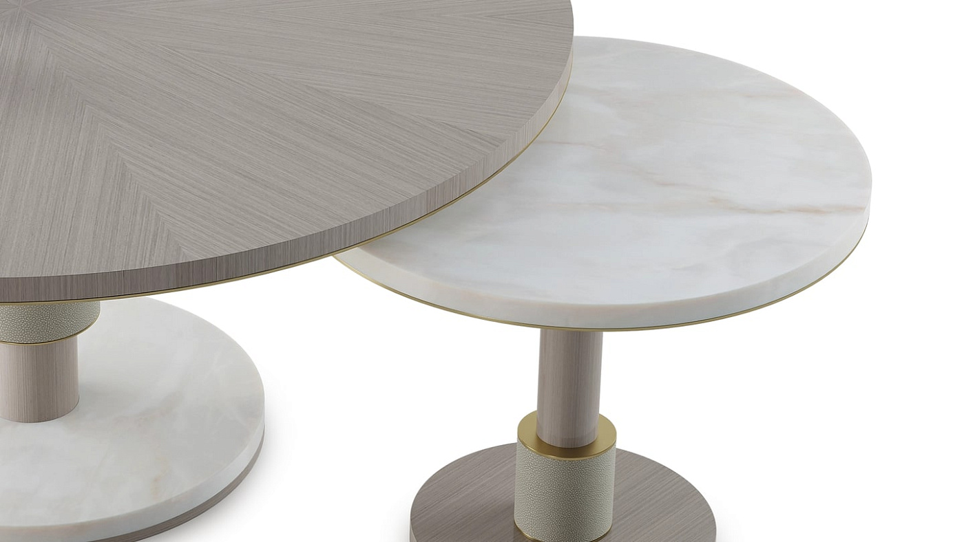 Журнальный столик CADIZ, изготовленный из сочетания деревянного шпона, камня, кожи и матовой латуни, - это простой способ дополнить ваше пространство сочетанием различных текстур и материалов. Конструкция, состоящая из двух отдельных объемов, которые могут разделяться или перекрываться, обладает встроенной