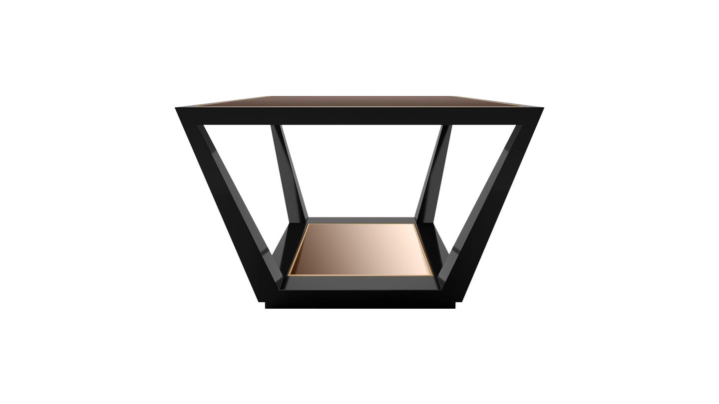 Журнальный столик HAMBURG умело использует светоотражающие материалы и размеры, чтобы играть с перспективами. Выполненный из смеси блестящего лака, глянцевого деревянного шпона и матовой латуни, его квадратный верх опирается на ножки, которые расширяются к основанию, где зеркальная инкрустация усиливает оптическую иллюзию.