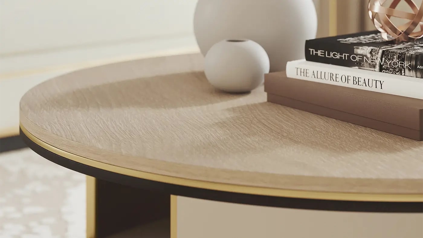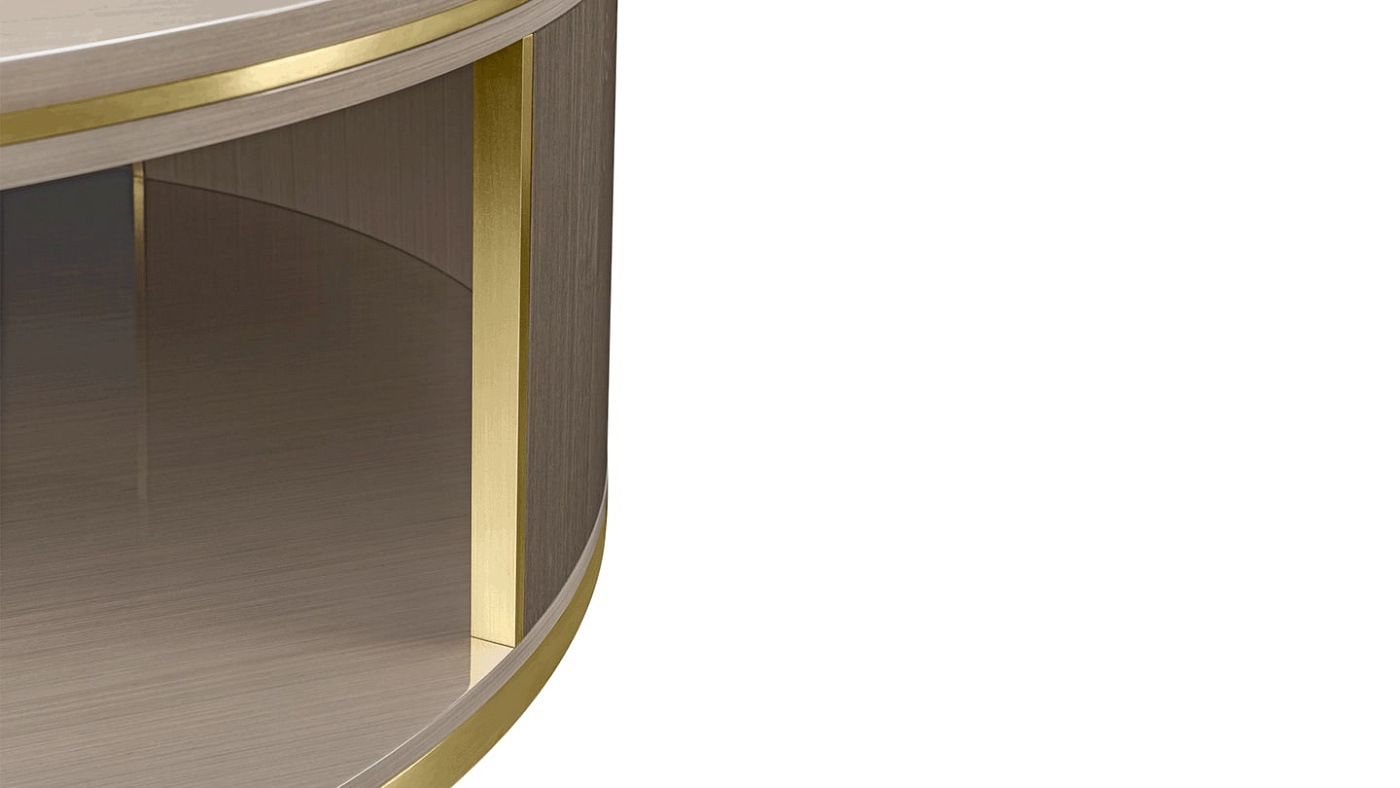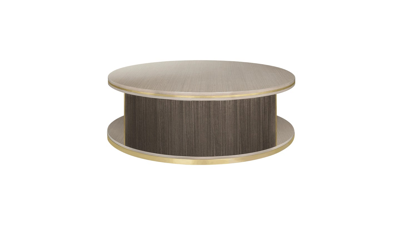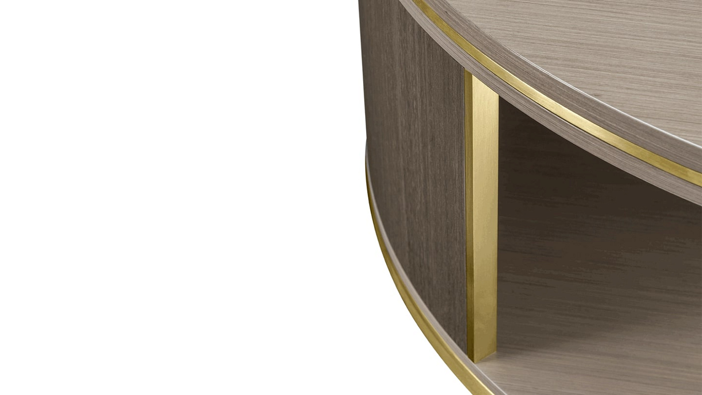Низкоуровневый журнальный столик LIVORNO, изготовленный из деревянного шпона двух оттенков с вставками из матовой латуни, обладает многомерной материальностью. Благодаря щедрой круглой форме он имеет полускрытое пространство, которое идеально подходит для хранения предметов, которыми пользуются время от времени, оставляя поверхность свободной для повседневных вещей.