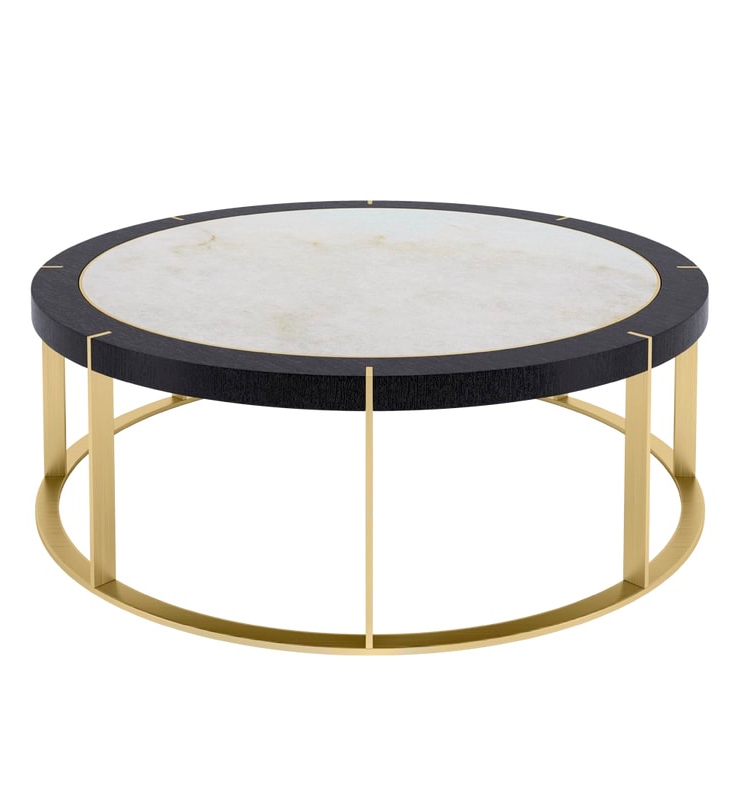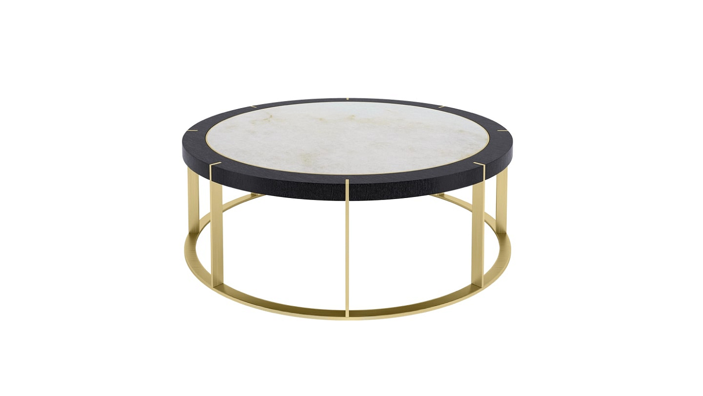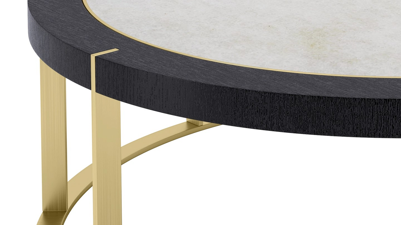Журнальный столик PRAGUE выполнен в форме барабана с круглым металлическим основанием и восемью тонкими ножками. Они прорезают внешние края поверхности, в центре которой находится камень, окруженный кольцами из металла и деревянного шпона.