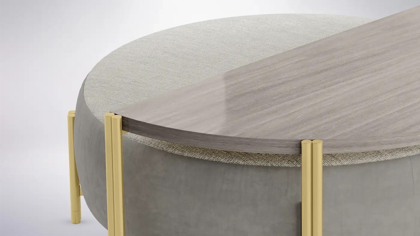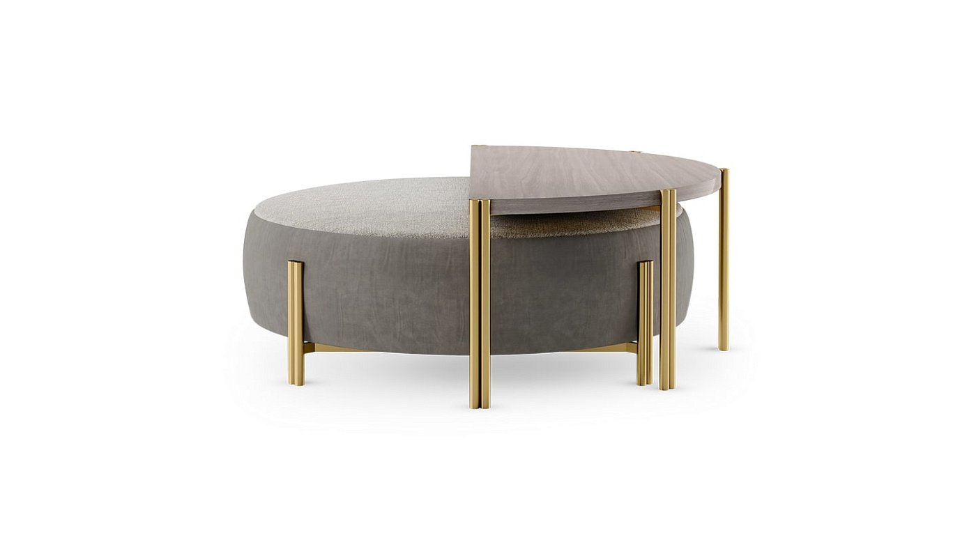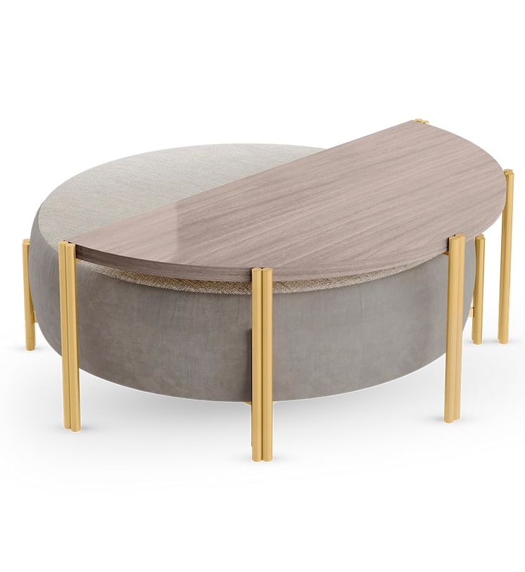 Журнальный столик RECIFE объединяет в себе две отдельные детали. Полукруглый журнальный столик из деревянного шпона накладывается на округлый табурет с мягкой обивкой, в то время как пары металлических трубчатых ножек, расположенных поперек обоих элементов, создают ощущение синхронности в целом.