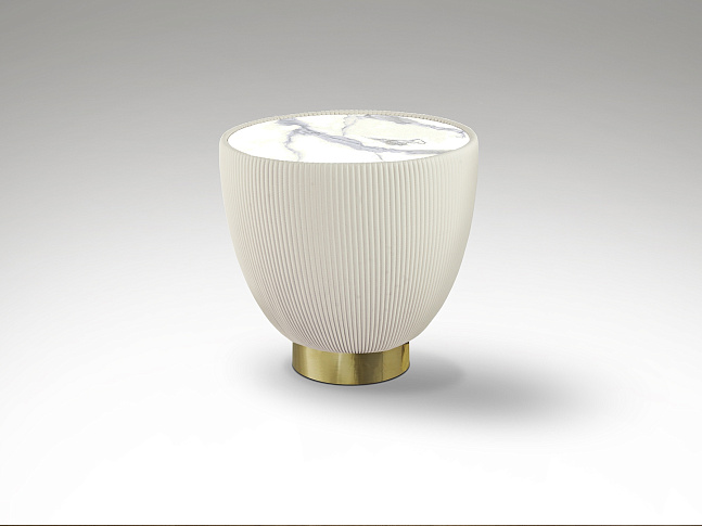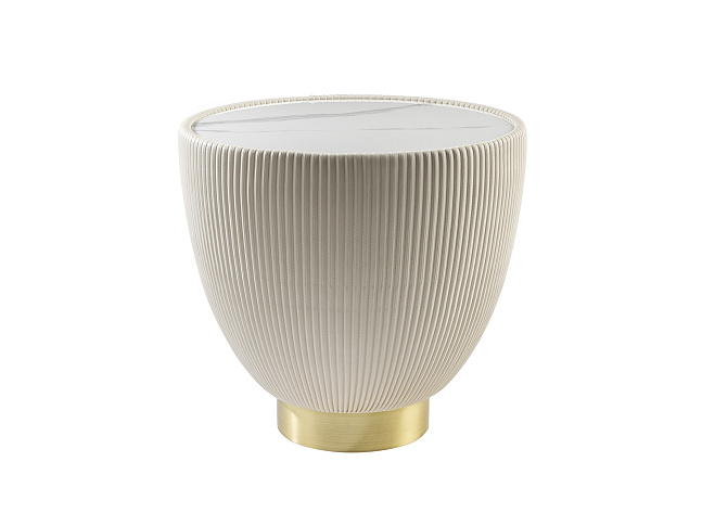 Круглый приставной столик, обитый белой плиссированной кожзаменителем, металлическое основание с латунной отделкой и столешница из спеченного камня с эффектом белого мрамора.