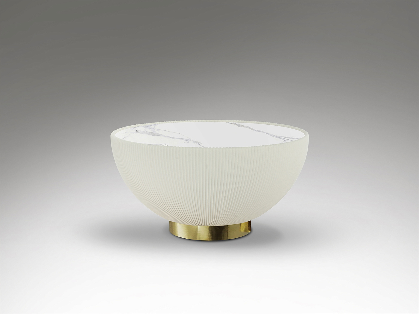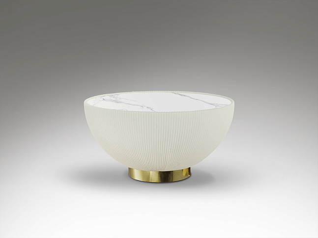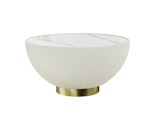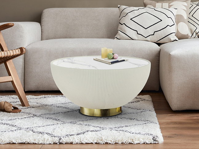 Круглый журнальный столик, обитый белой плиссированной искусственной кожей, металлическое основание с латунной отделкой и столешница из спеченного камня с эффектом белого мрамора.