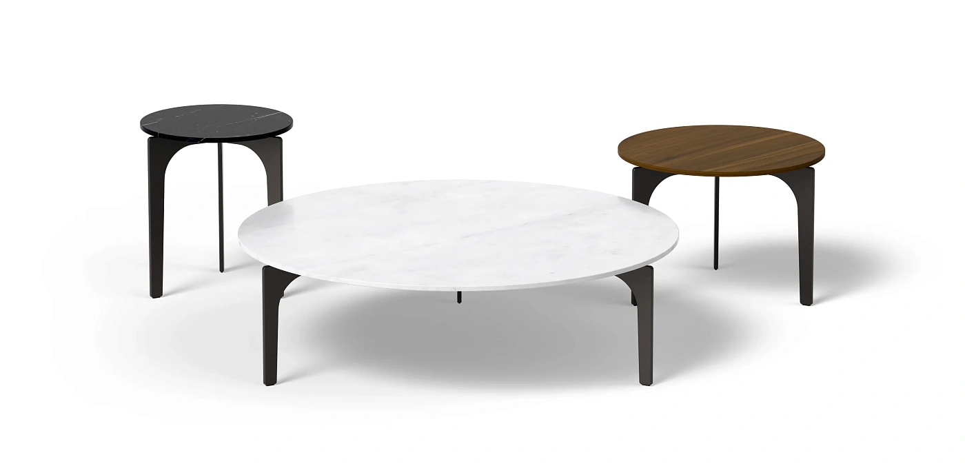 Коллекция очень легких и воздушных приставных столиков, опирающихся на три ножки, которые образуют дугу, объединяя металлическую основу с оболочкой из дерева, натурального или технического камня. С использованием органического языка конструкция ножек обеспечивает очень легкий обзор спереди, в отличие от более широких при боковом просмотре. Конструкция этого основания соединяется с языком ножек переднего дивана в его подвесном варианте. РАЗРАБОТАН МАРИО РУИСОМ