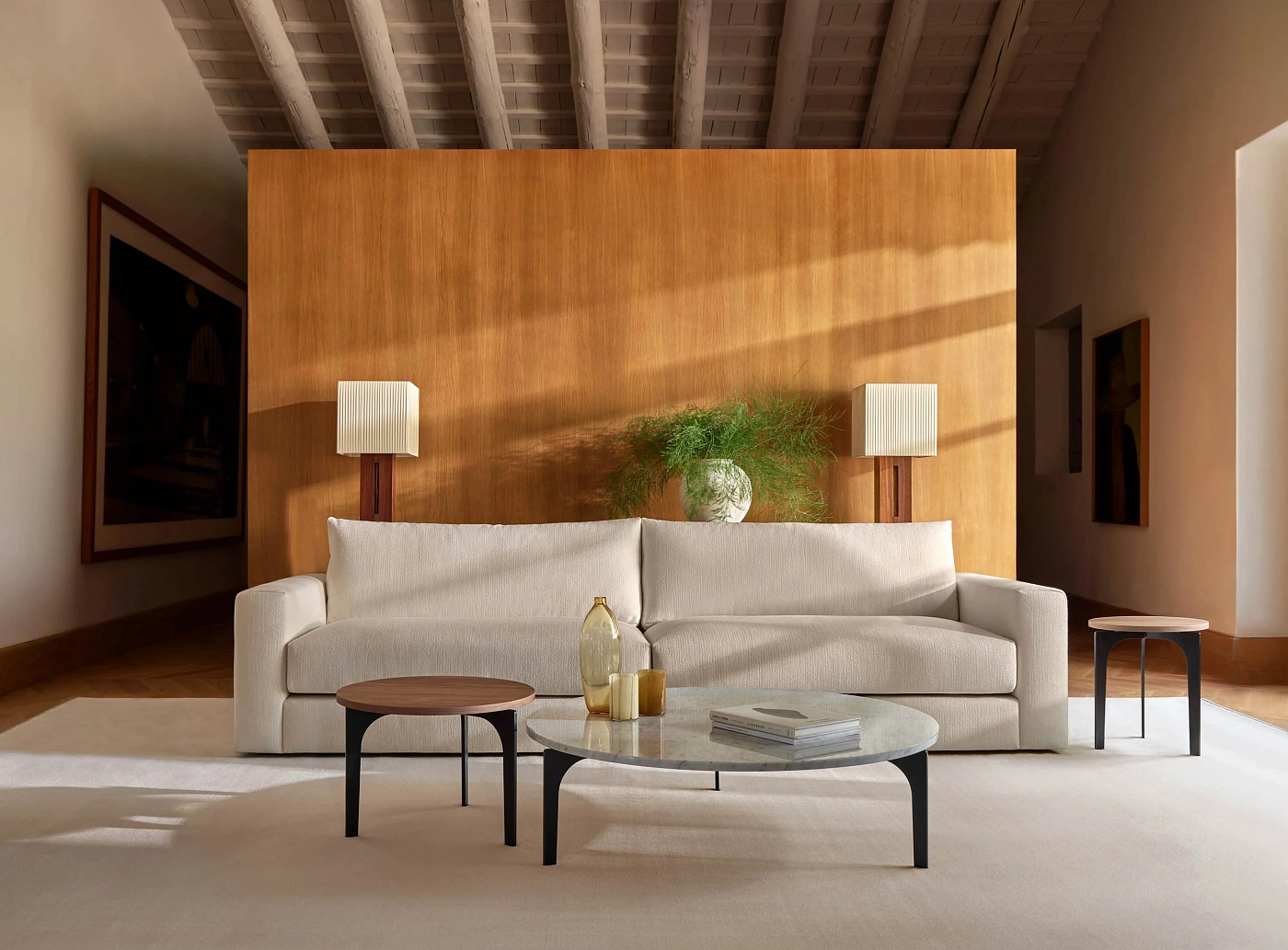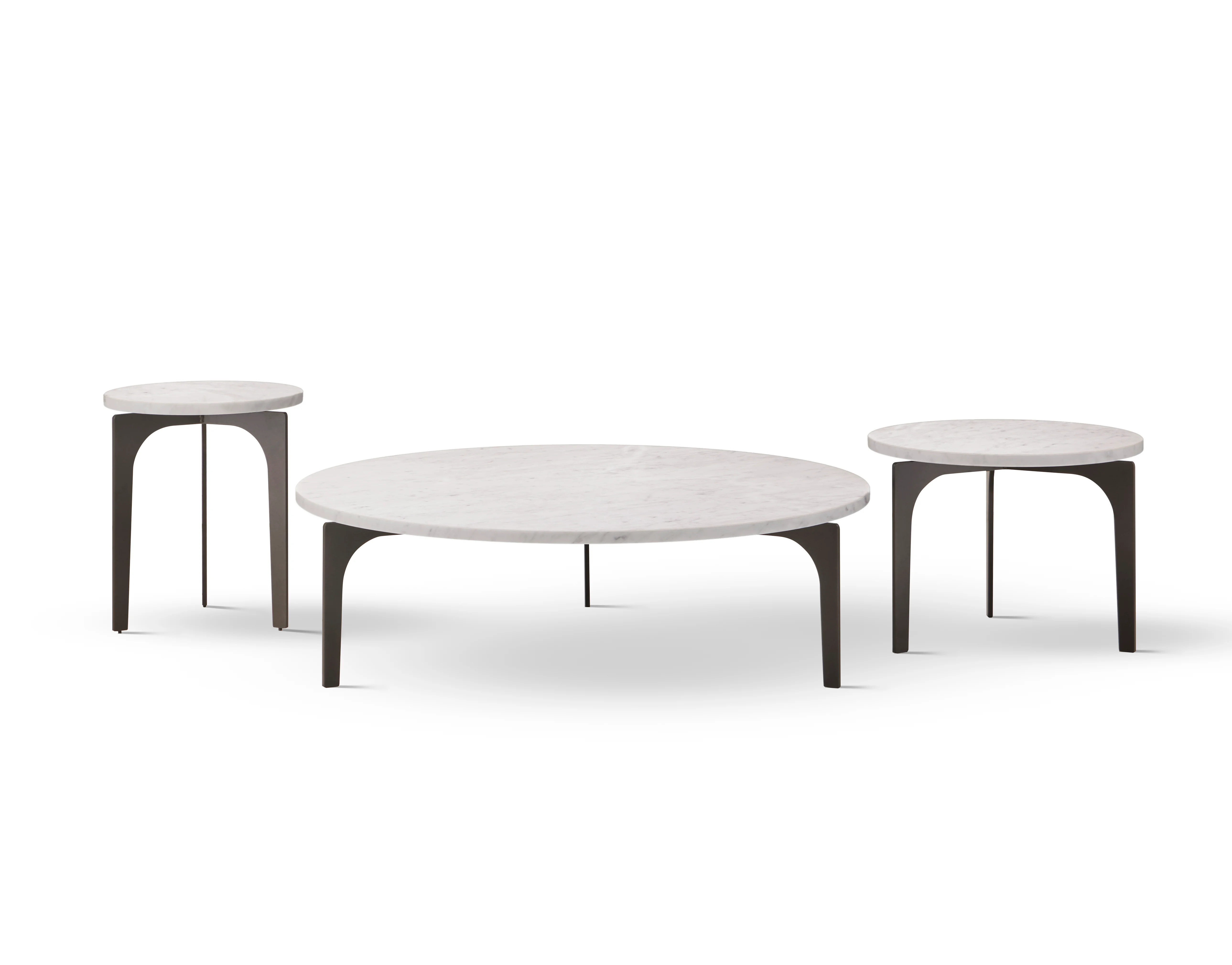 Коллекция очень легких и воздушных приставных столиков, опирающихся на три ножки, которые образуют дугу, объединяя металлическую основу с оболочкой из дерева, натурального или технического камня. С использованием органического языка конструкция ножек обеспечивает очень легкий обзор спереди, в отличие от более широких при боковом просмотре. Конструкция этого основания соединяется с языком ножек переднего дивана в его подвесном варианте. РАЗРАБОТАН МАРИО РУИСОМ