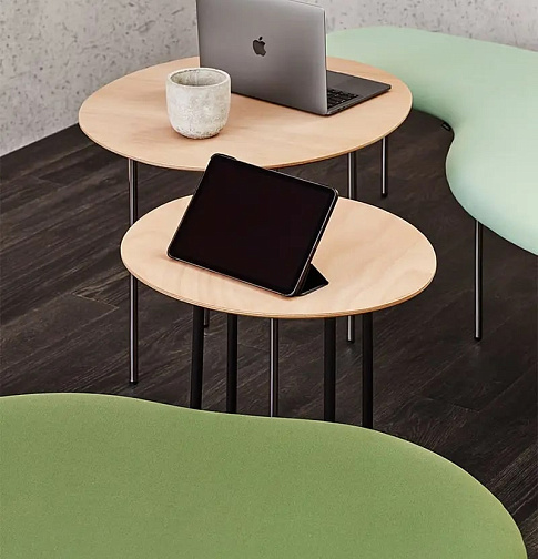 Мягкие стулья/пуфы, органической формы, которая может быть использована в многократных пространствах, так как они выглядят по-разному, когда поворачиваются. Основная структура коллекции основана на 15-миллиметровой березовой фанере, обеспечивающей прочность изделию. Покрыта двумя разными огнеупорными пенами, чтобы сделать ее удобной. Ножки из железной трубки 16 мм. Боковые столы различной высоты. Столешницы из ДВП и бука.