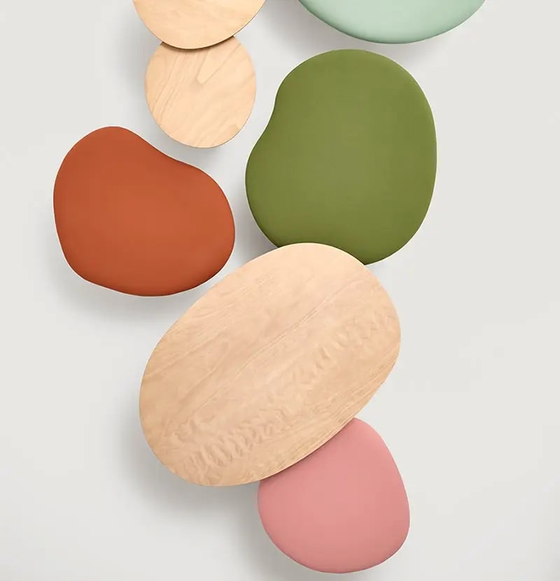 Мягкие стулья/пуфы, органической формы, которая может быть использована в многократных пространствах, так как они выглядят по-разному, когда поворачиваются. Основная структура коллекции основана на 15-миллиметровой березовой фанере, обеспечивающей прочность изделию. Покрыта двумя разными огнеупорными пенами, чтобы сделать ее удобной. Ножки из железной трубки 16 мм. Боковые столы различной высоты. Столешницы из ДВП и бука.