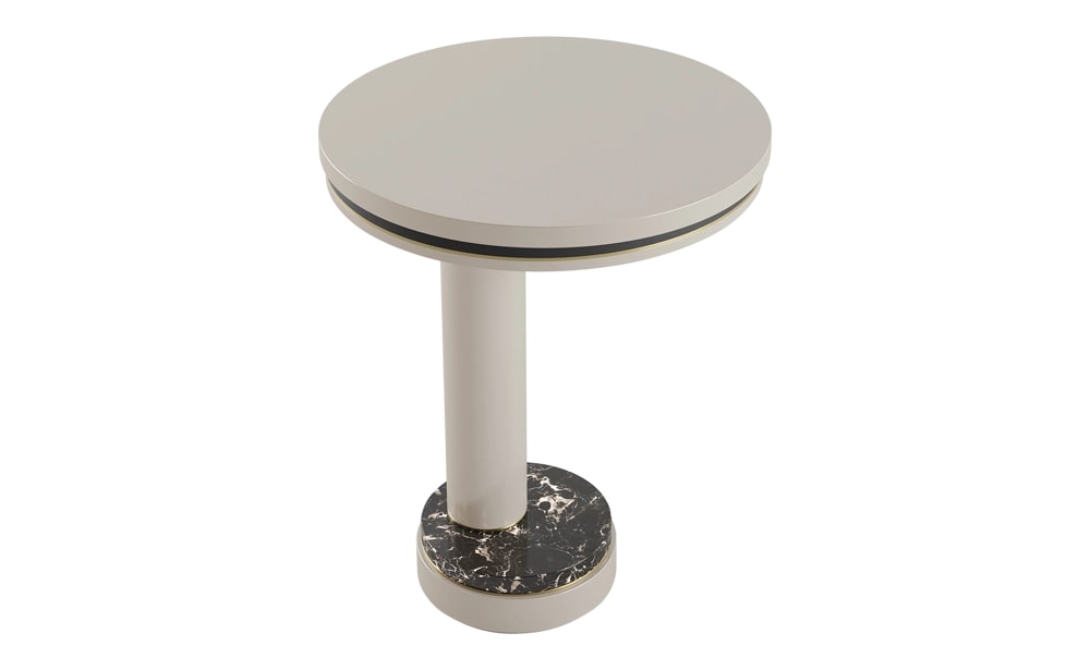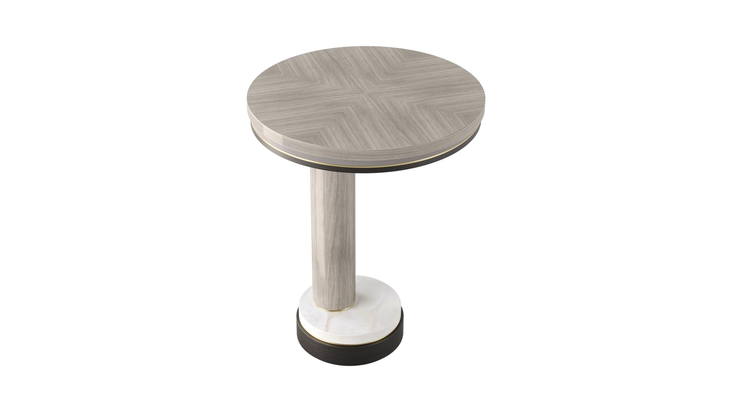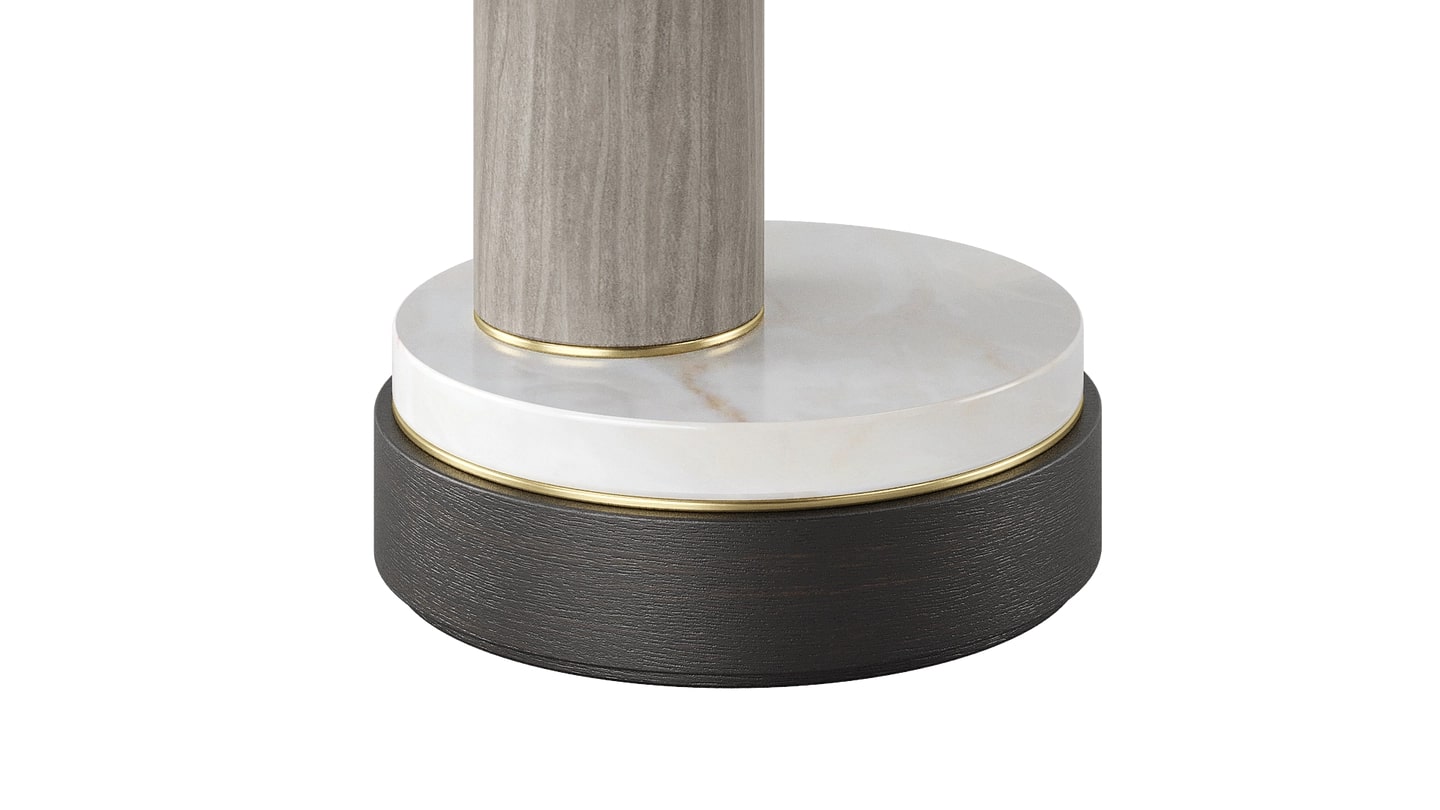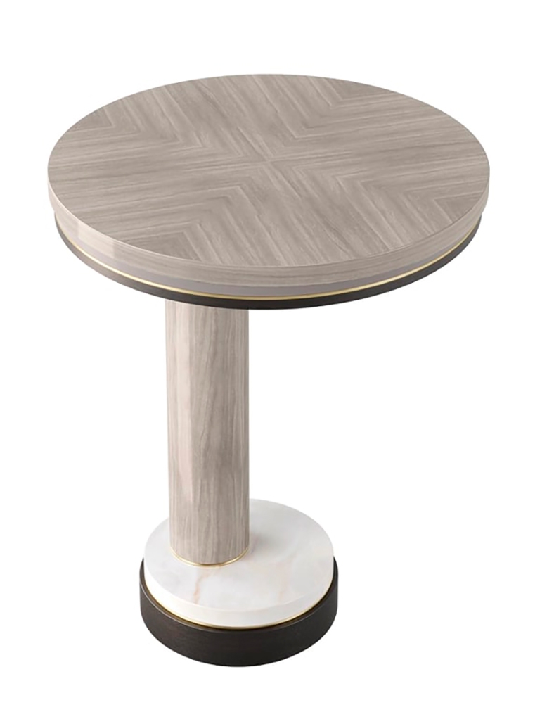 Характерное каменное основание приставного столика AVILA, выполненное из лакированного дерева различных тонов, деревянного шпона и матовой латуни, дополняет дизайн, позволяя причудливо расположить ножку не по центру.