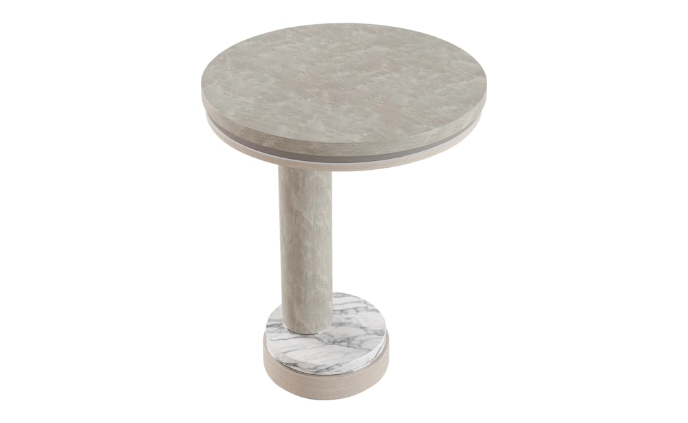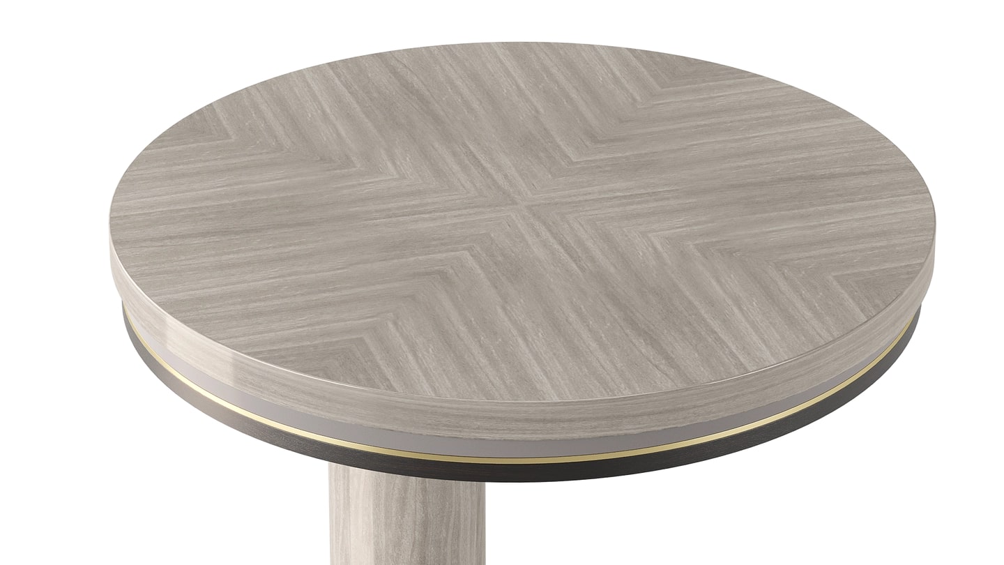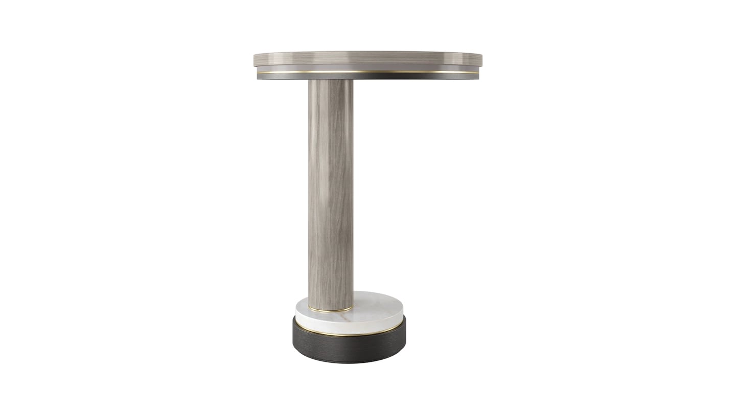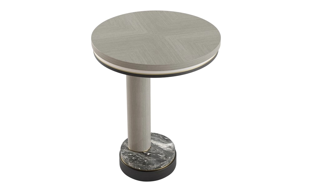 Характерное каменное основание приставного столика AVILA, выполненное из лакированного дерева различных тонов, деревянного шпона и матовой латуни, дополняет дизайн, позволяя причудливо расположить ножку не по центру.
