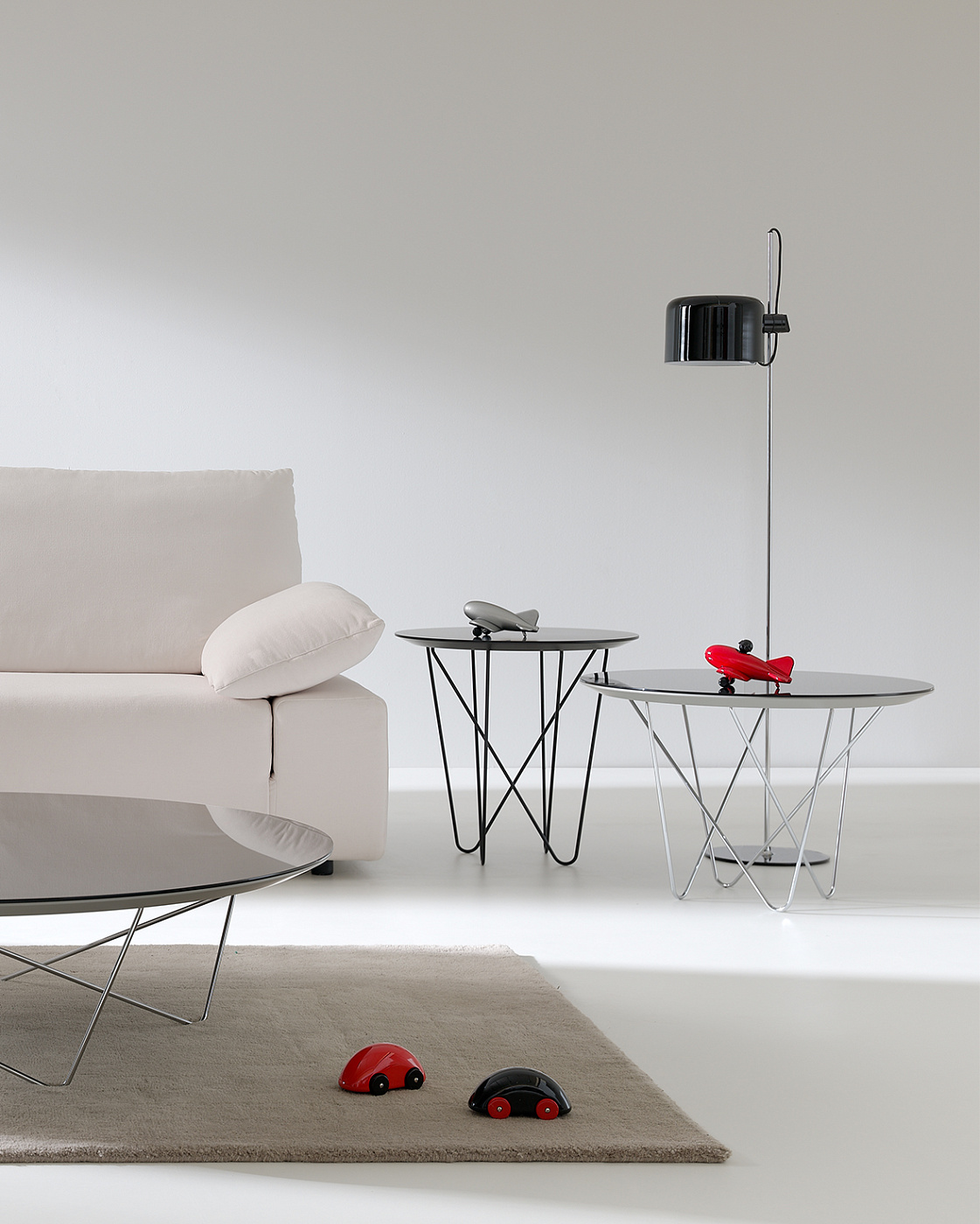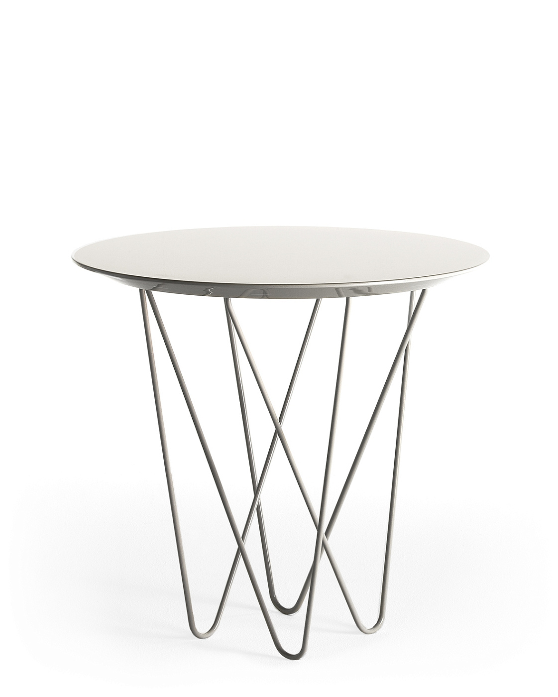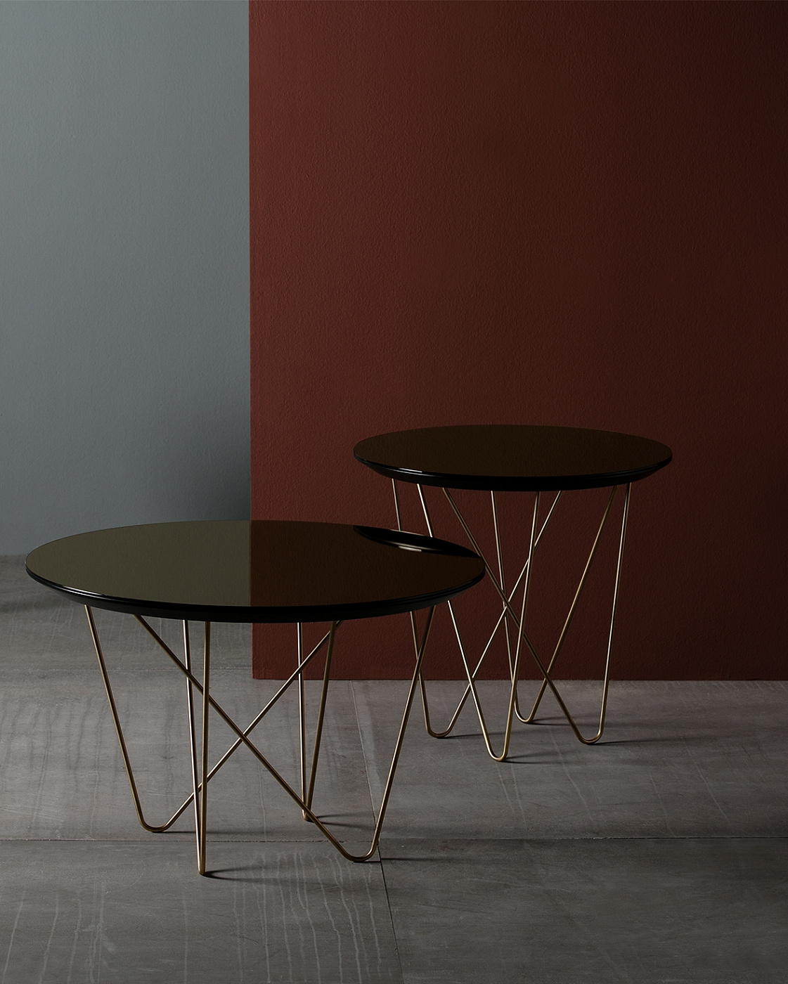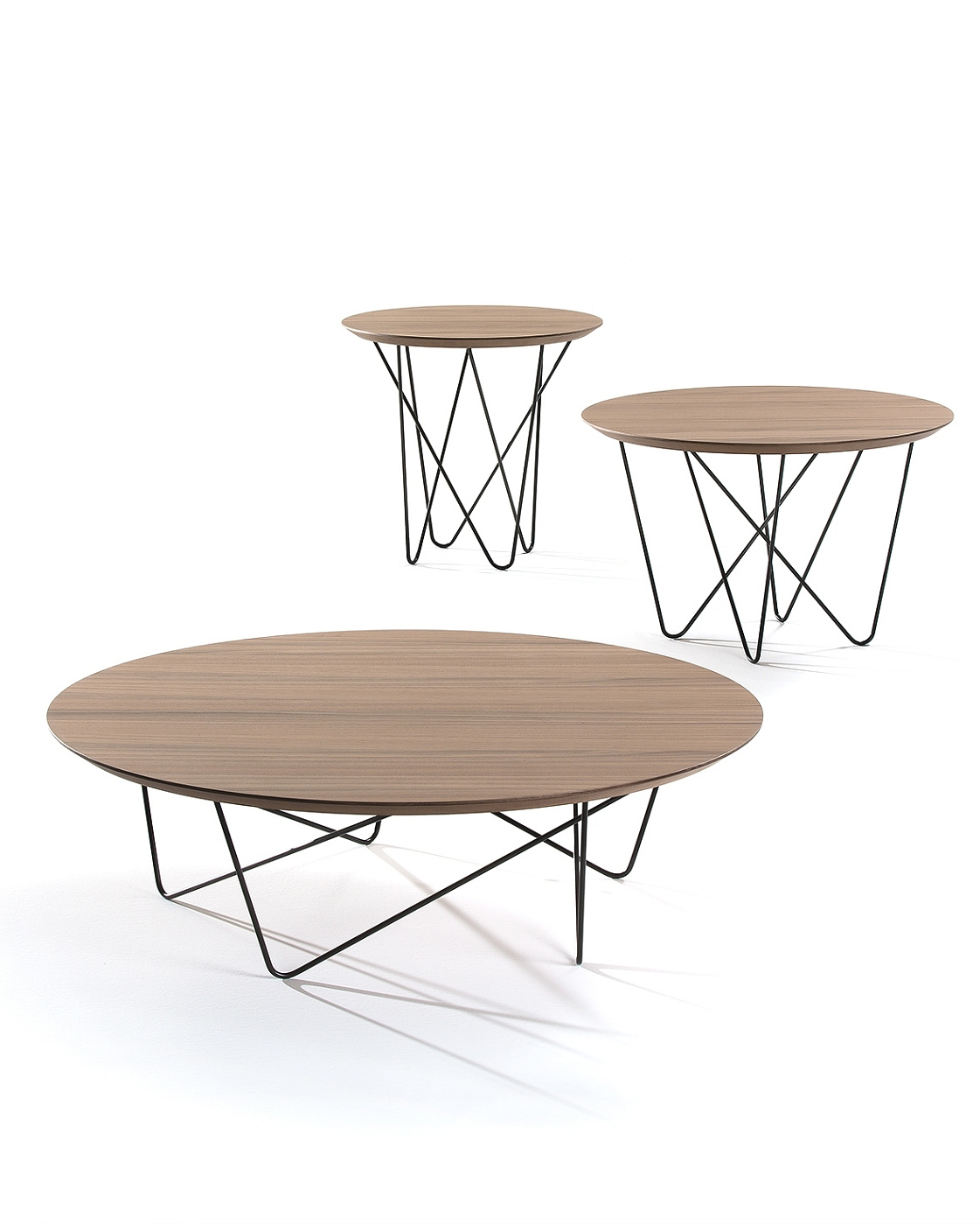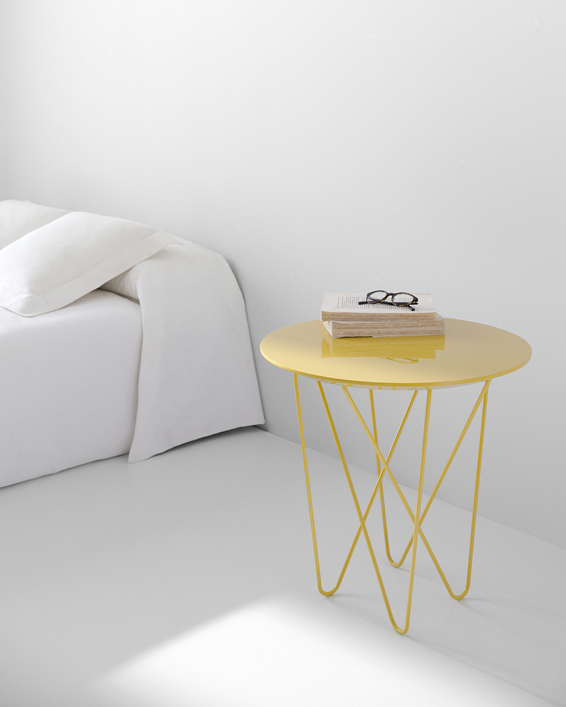 Yohsi - это набор приставных столиков, состоящий из круглой столешницы, опирающейся на решетку из изогнутых металлических стержней, которые являются основой изделия.