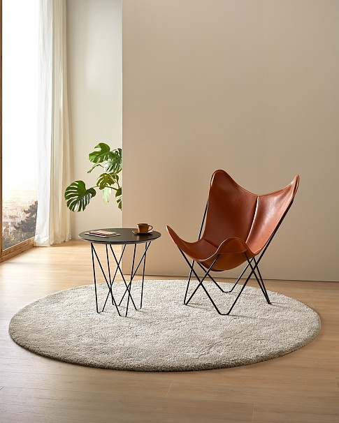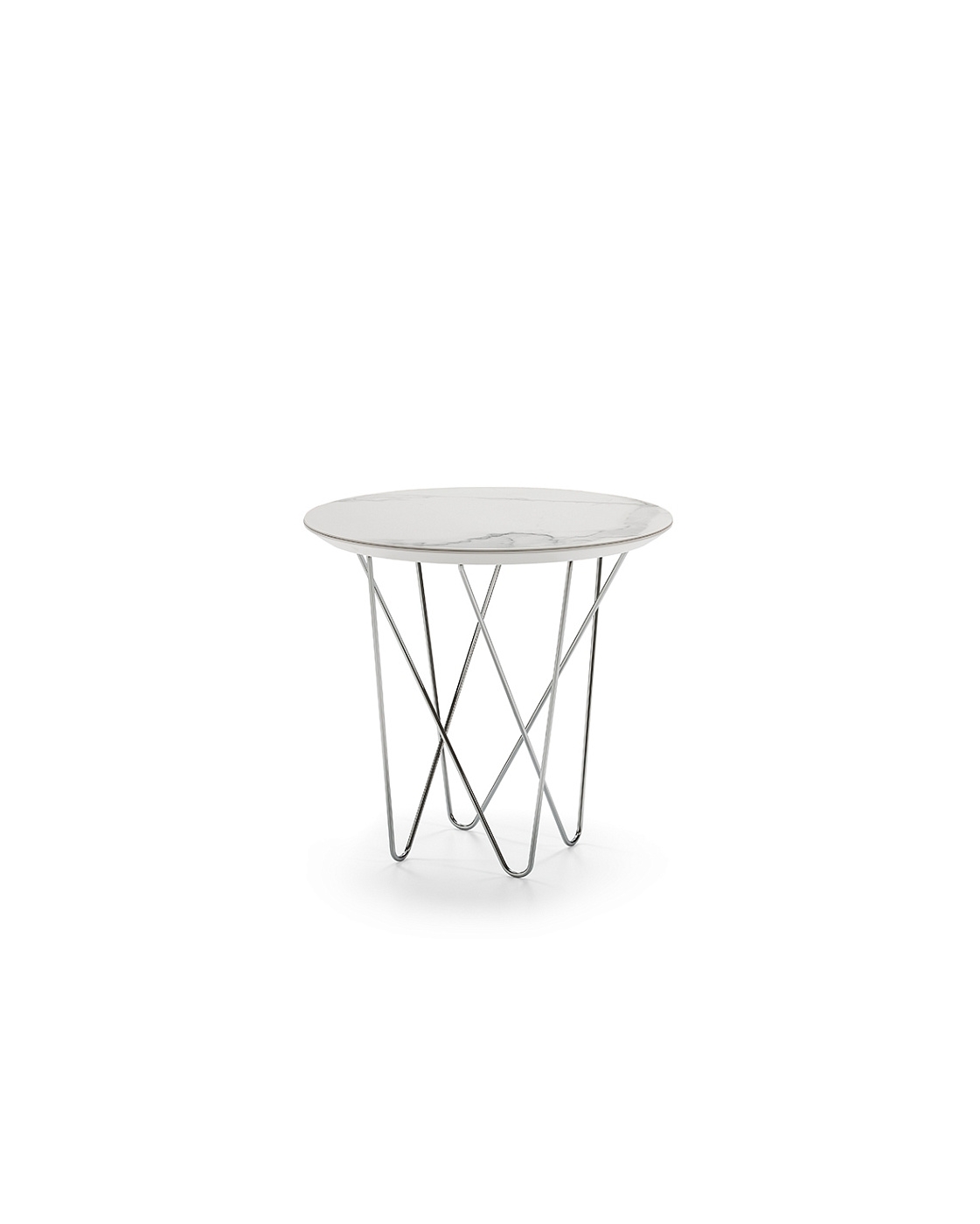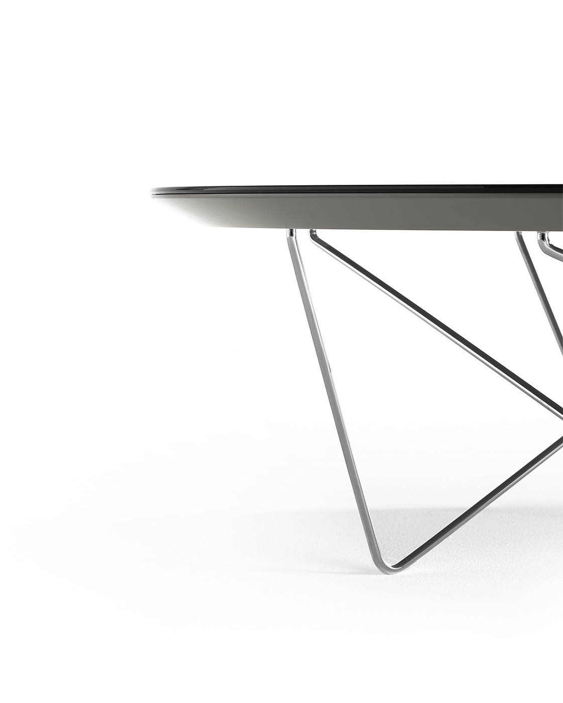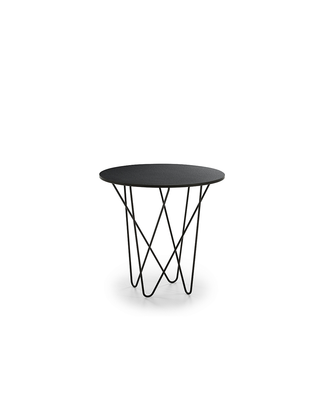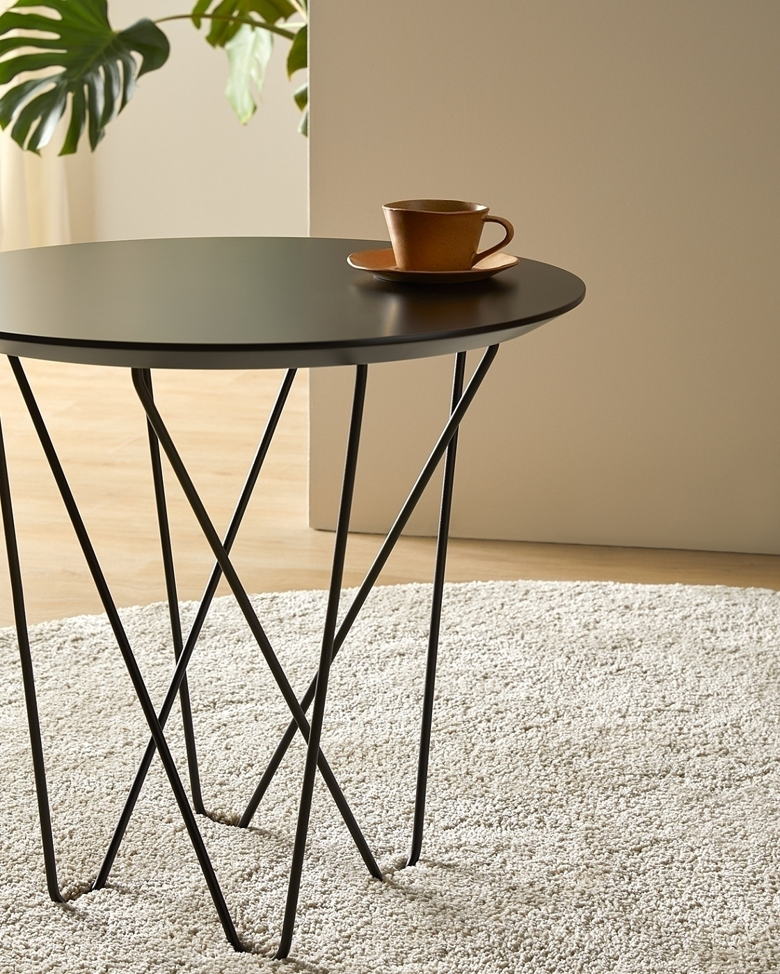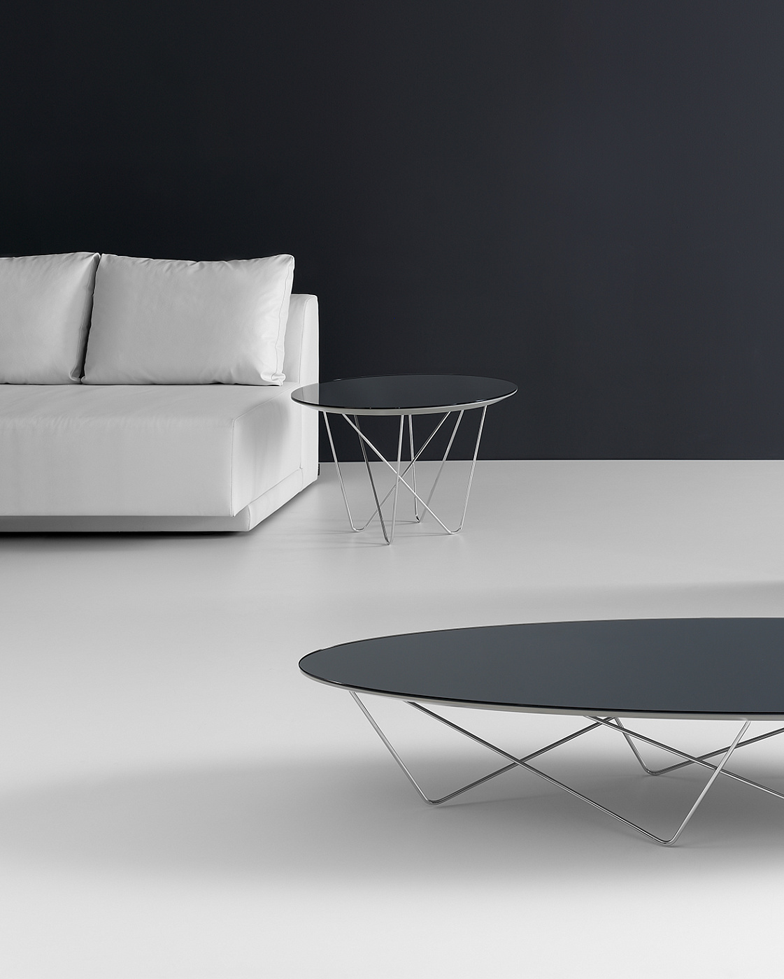 Yohsi - это набор приставных столиков, состоящий из круглой столешницы, опирающейся на решетку из изогнутых металлических стержней, которые являются основой изделия.