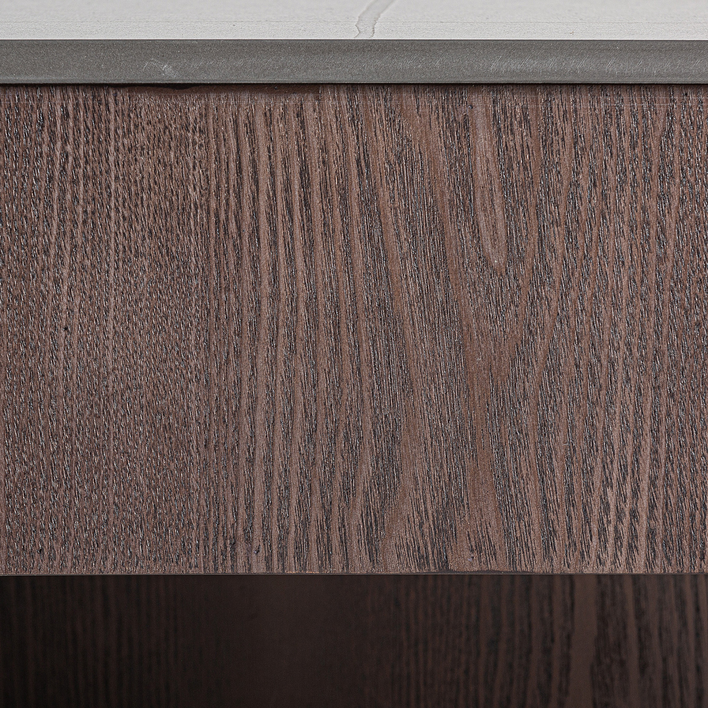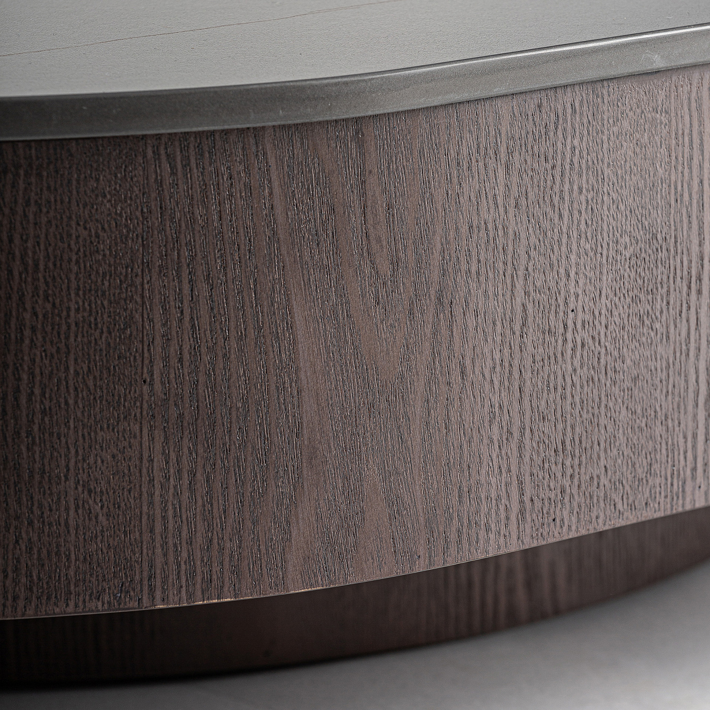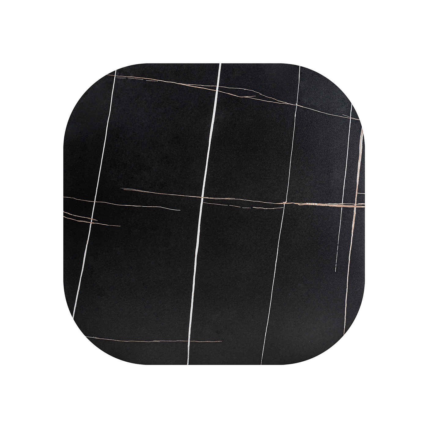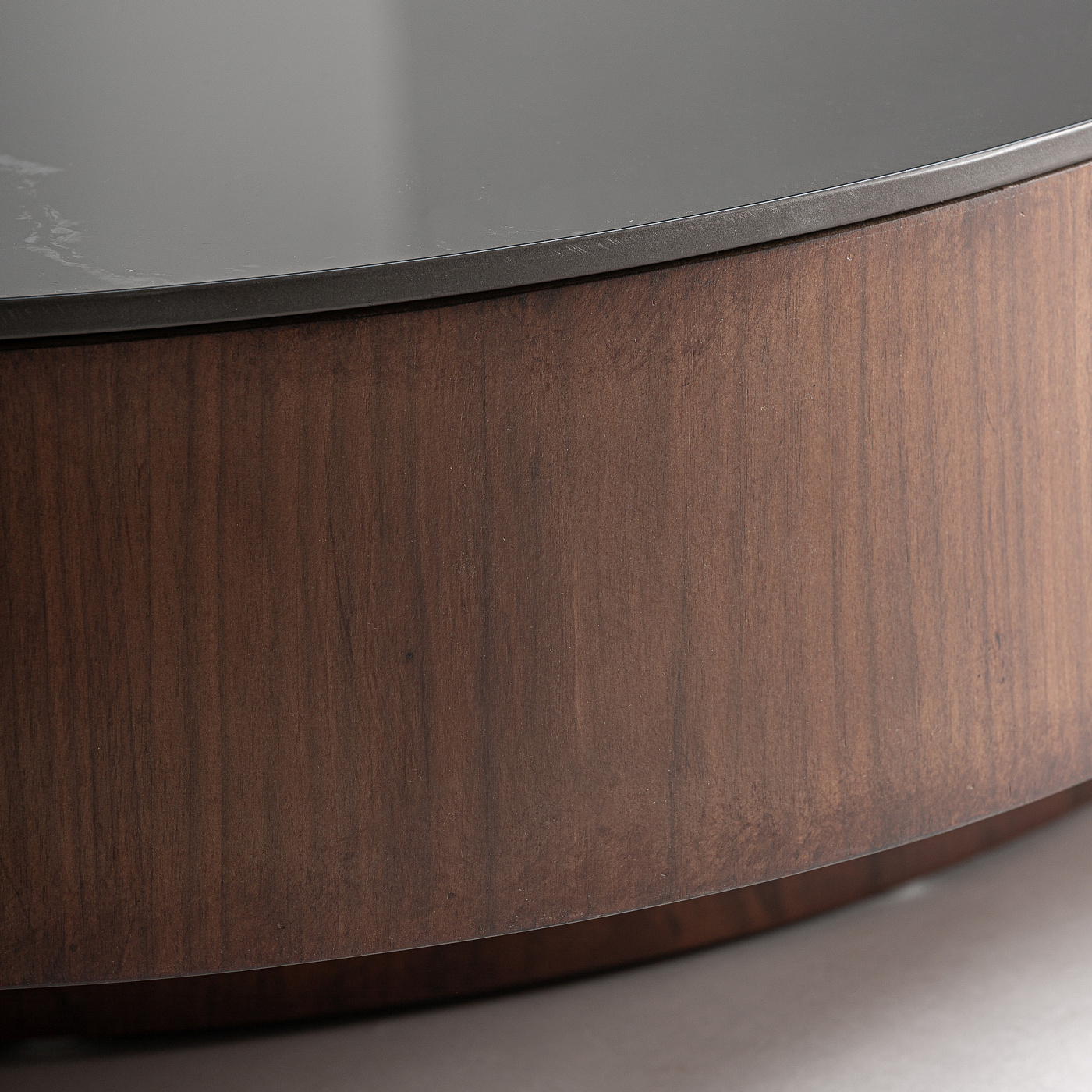 Современный журнальный столик Neufs, изготовленный из черного синтетического мрамора в сочетании с коричневой фанерой и ореховым шпоном. Ширина: 100 см, Глубина: 100 см, Высота: 25 см
