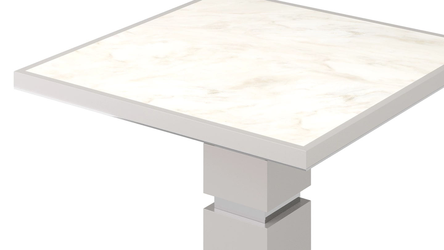 Единственный в нашей коллекции стол BERGAMO с квадратной столешницей, выполненный в стиле ар-деко, привносит очарование благодаря пьедесталу, похожему на тотем, и сочетанию нетронутого камня, глянцевого лакированного дерева и блестящей стали.