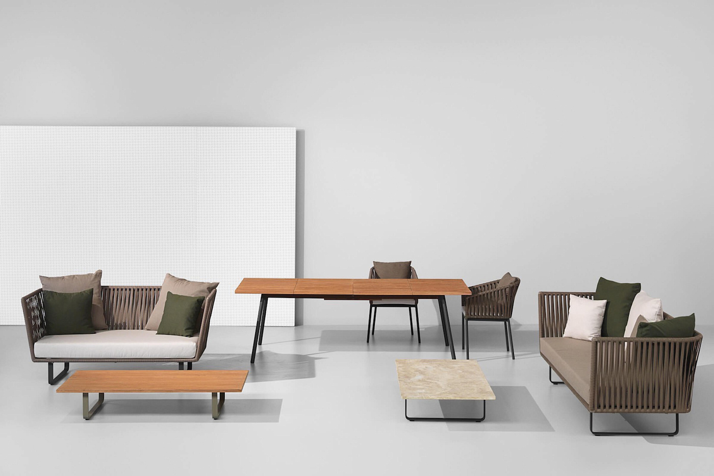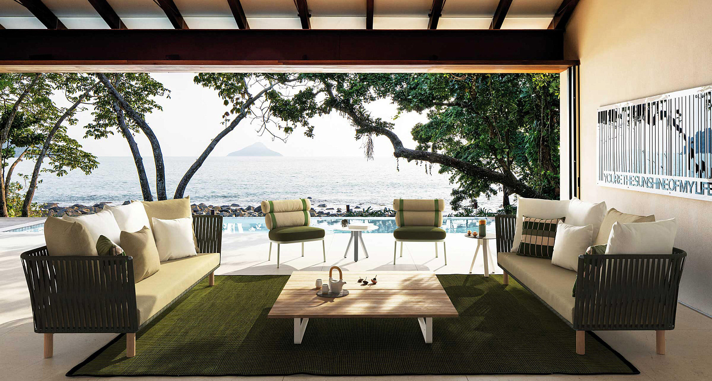 Для Kettal Bitta характерно сочетание алюминиевых и тиковых рам, сидений из плетеного полиэстера и удобных подушек, столешниц из тикового дерева или камня - и все это с использованием всех водонепроницаемых материалов. “Намерение дизайнера состояло в том, чтобы создать плотную оплетку, которая все еще пропускала бы воздух, напоминающую оплетку канатов, используемых для швартовки лодок (отсюда и название Bitta, что в переводе с итальянского означает "швартовка"), благодаря чему изделия выглядят легкими, но в то же время они выглядят прямо как уютные гнездышки в естественных тонах, в которых можно посидеть и расслабиться.”
