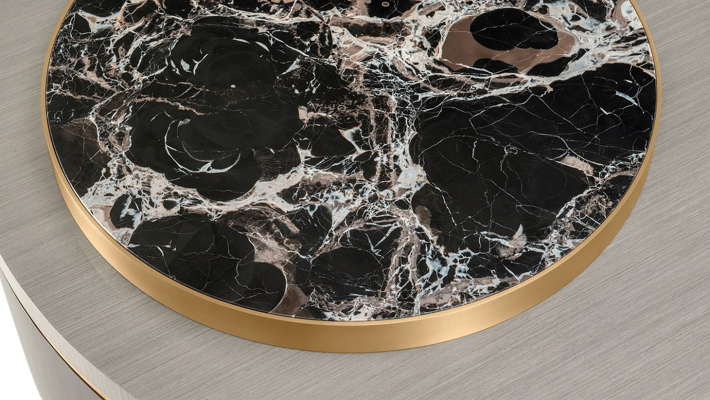 Изысканный журнальный столик ATLANTA, представляющий собой симфонию кругов и материалов, искусно отделан металлическим и деревянным шпоном. На поверхности вращающийся поднос из камня с металлической отделкой расположен не по центру для придания оригинального и практичного завершающего штриха.