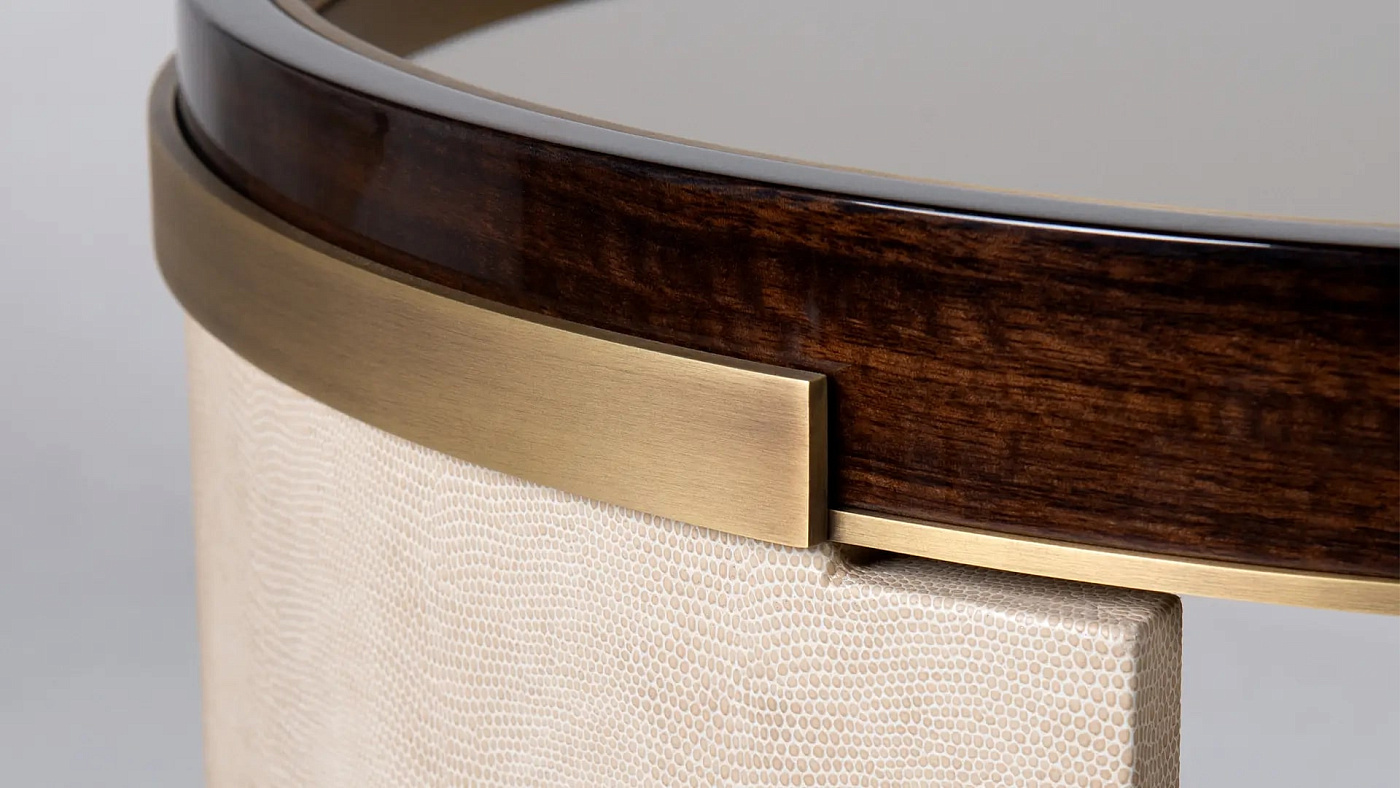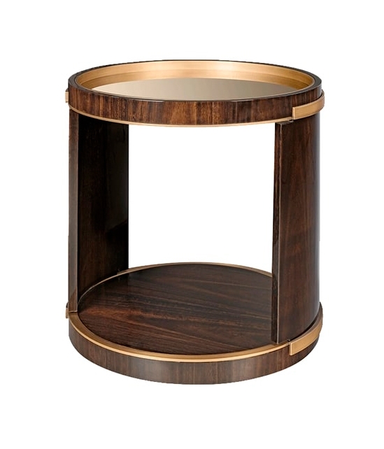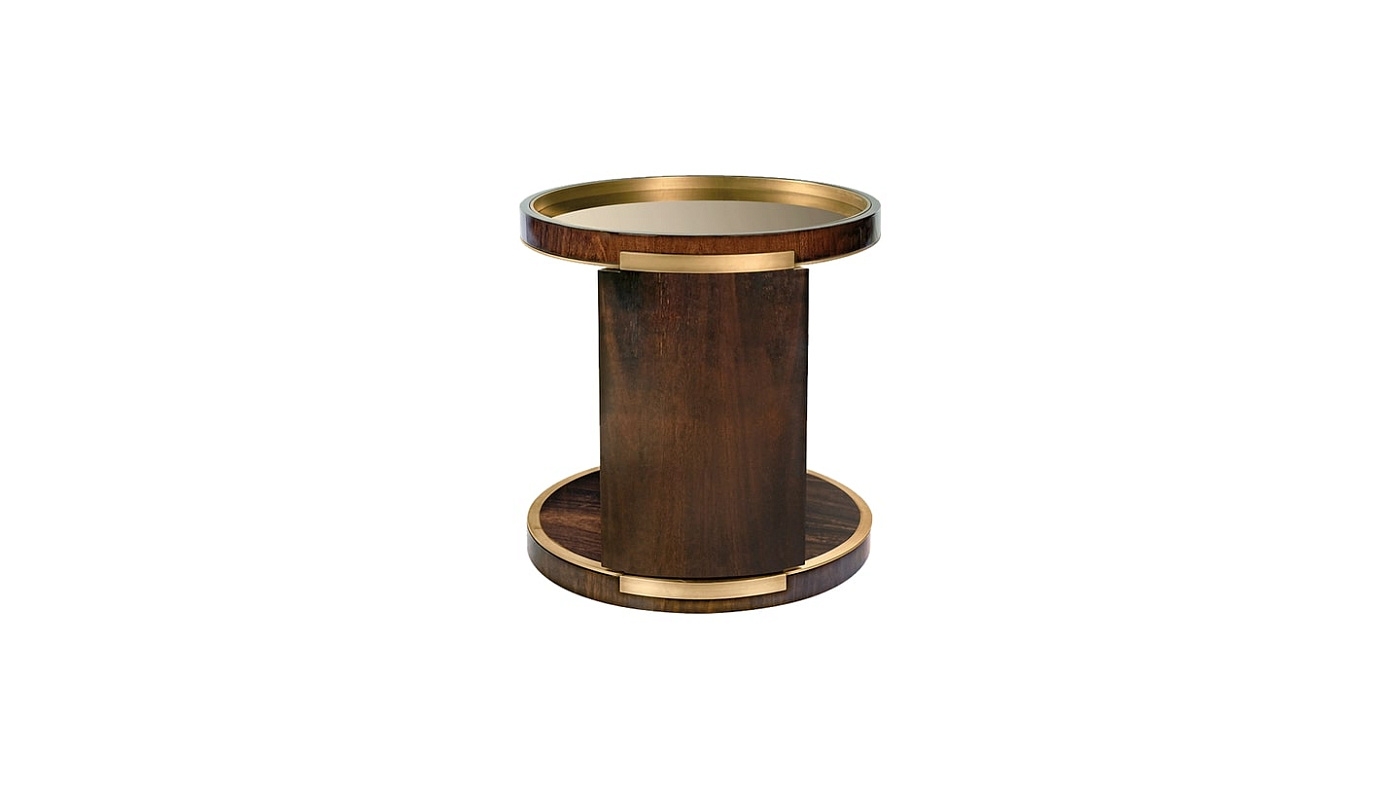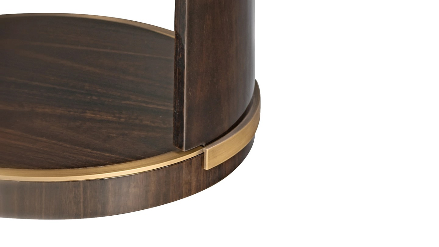 Столик в форме барабана, выполненный из богатого сочетания глянцевого шпона темного дерева и роскошной матовой латуни, поднимает настроение благодаря зеркальной поверхности из бронзы. Это искусно отразит все, что находится сверху, в то время как открытая полка внизу обеспечивает достаточно места для хранения.