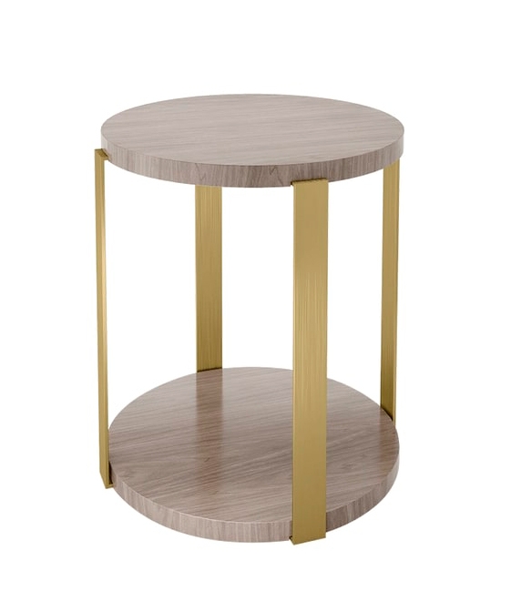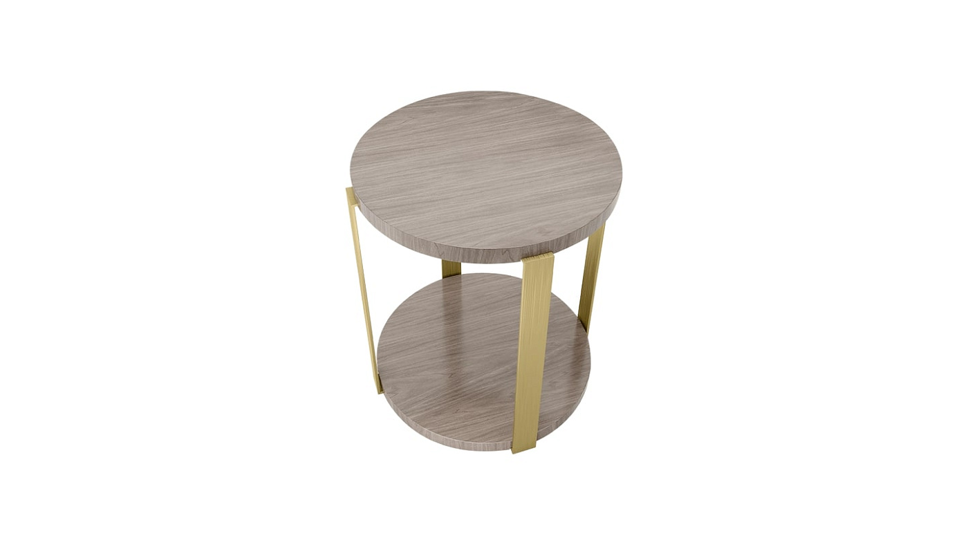 Приставной столик Деним, состоящий из двух кругов из глянцевого деревянного шпона, поддерживаемых четырьмя полосками из матовой латуни, одновременно прост и эффектен. Положите повседневные предметы сверху, а менее часто используемые - снизу.