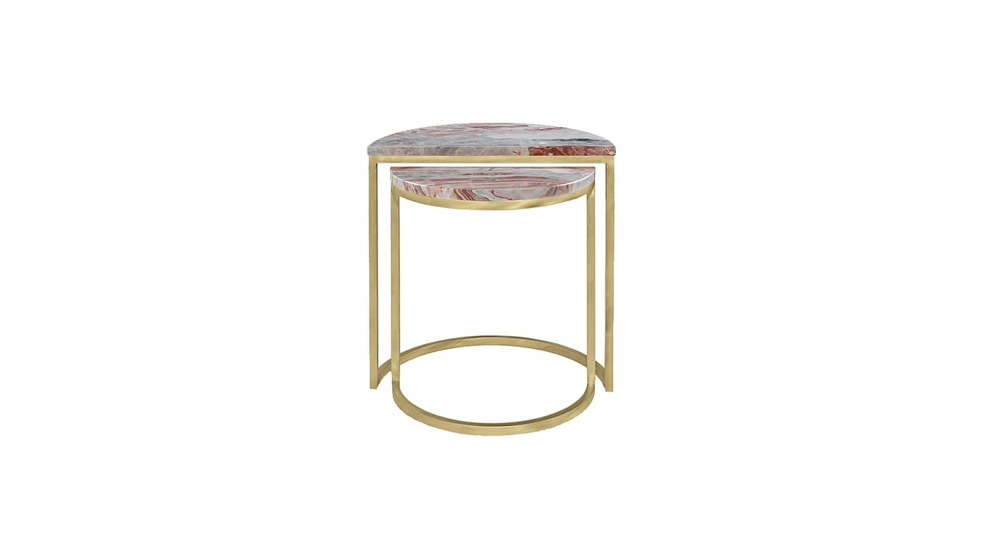 Очаровательный приставной столик в форме кабошона с основанием из матовой латуни и поверхностями в форме полумесяца из разноцветного камня состоит из двух независимых половинок. Расположитесь кружком или прижмитесь друг к другу.
