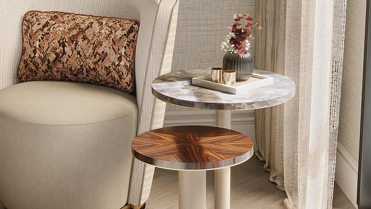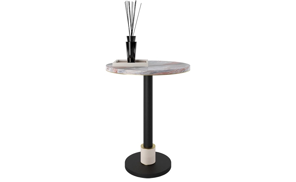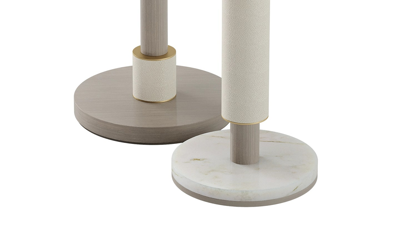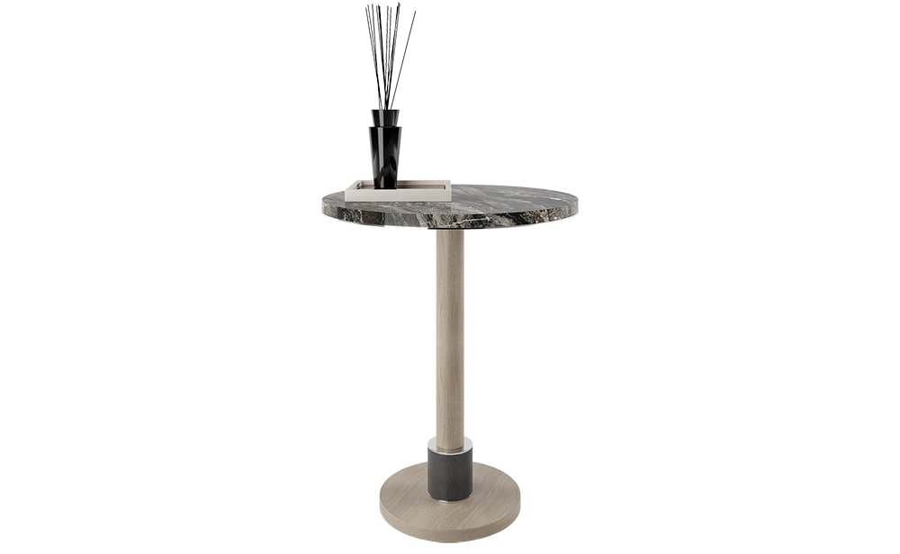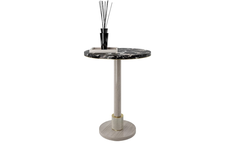 Традиционный на вид пьедестал с фирменной кожаной манжетой у основания ножки, неподвластный времени приставной столик CADIZ сочетает в себе нетронутую каменную поверхность со структурой деревянного шпона и акцентами из матовой латуни.