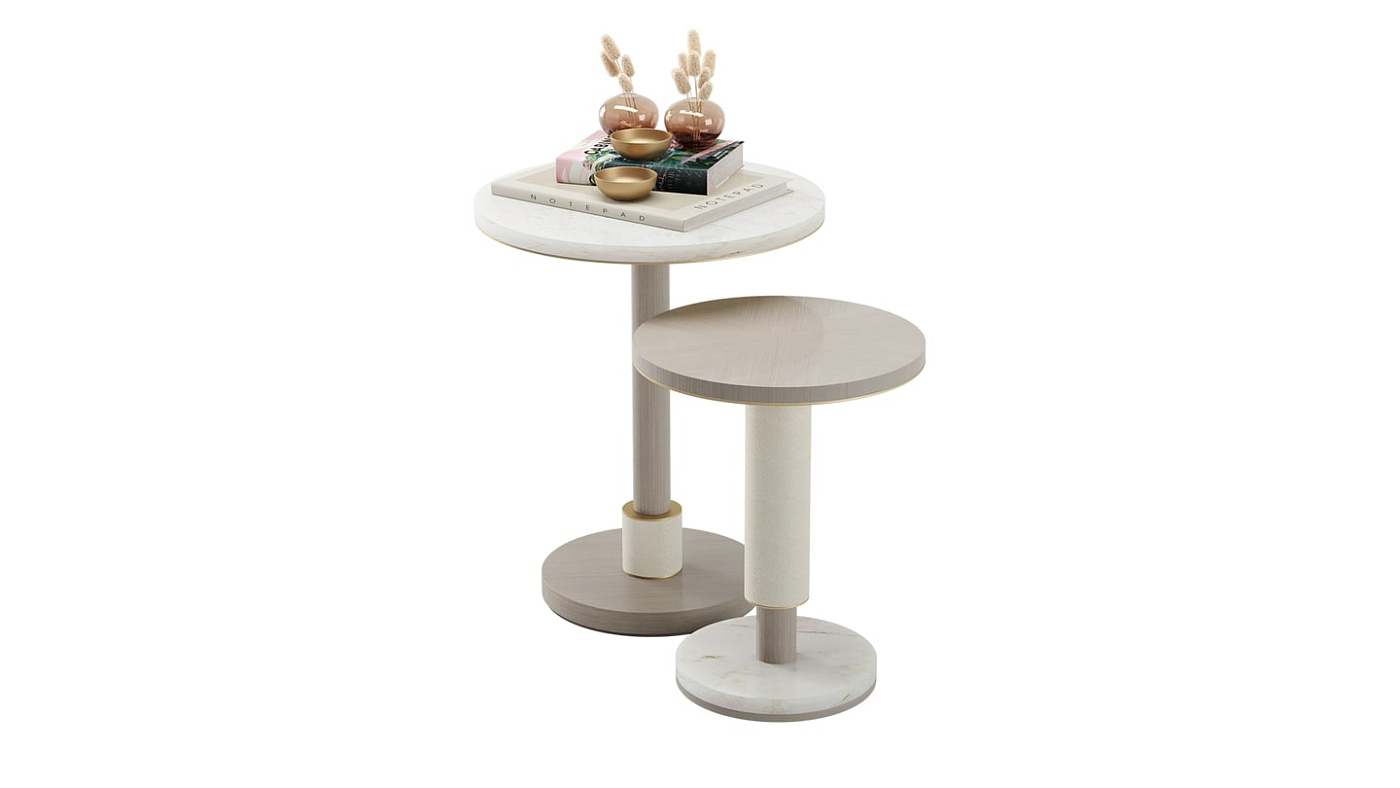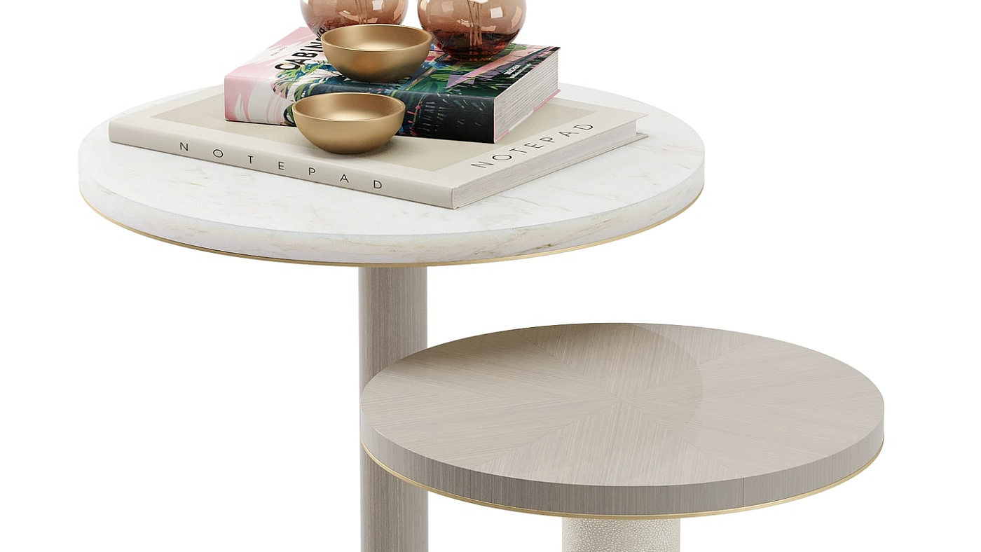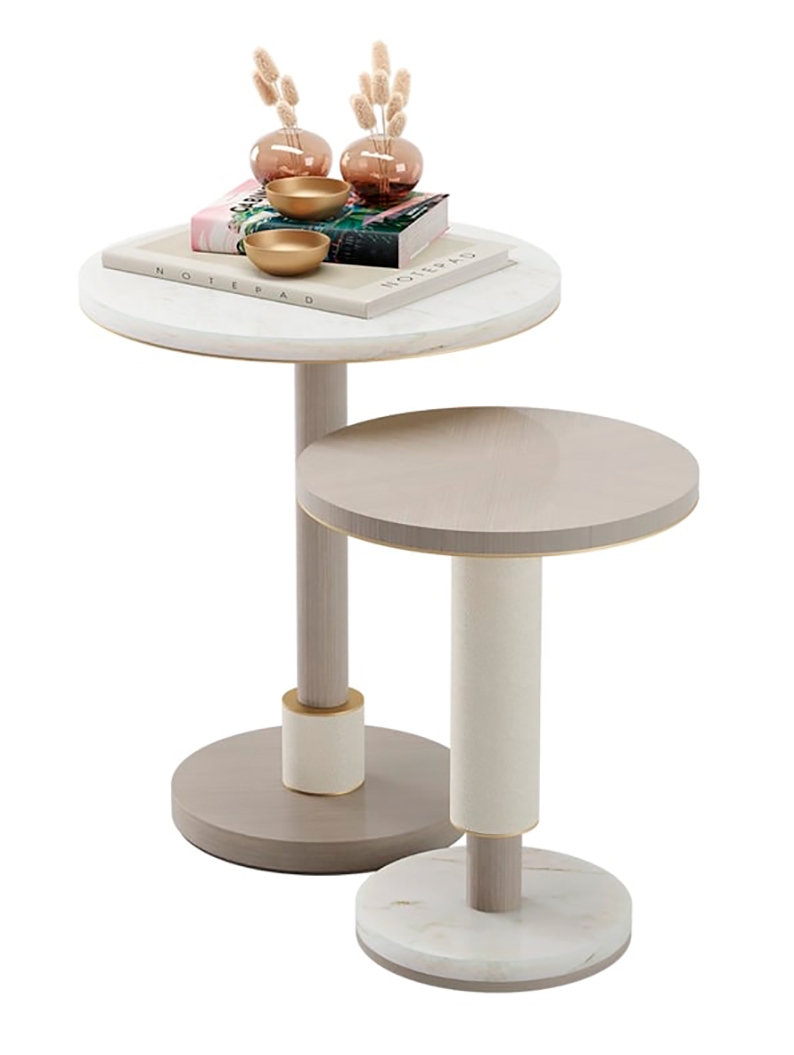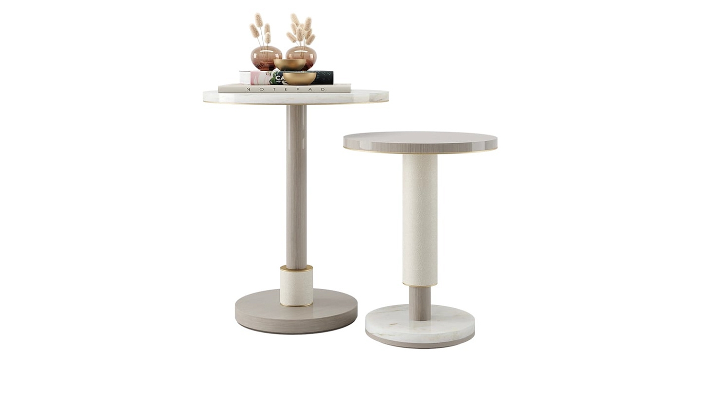 Традиционный на вид пьедестал с фирменной кожаной манжетой у основания ножки, неподвластный времени приставной столик CADIZ сочетает в себе нетронутую каменную поверхность со структурой деревянного шпона и акцентами из матовой латуни.