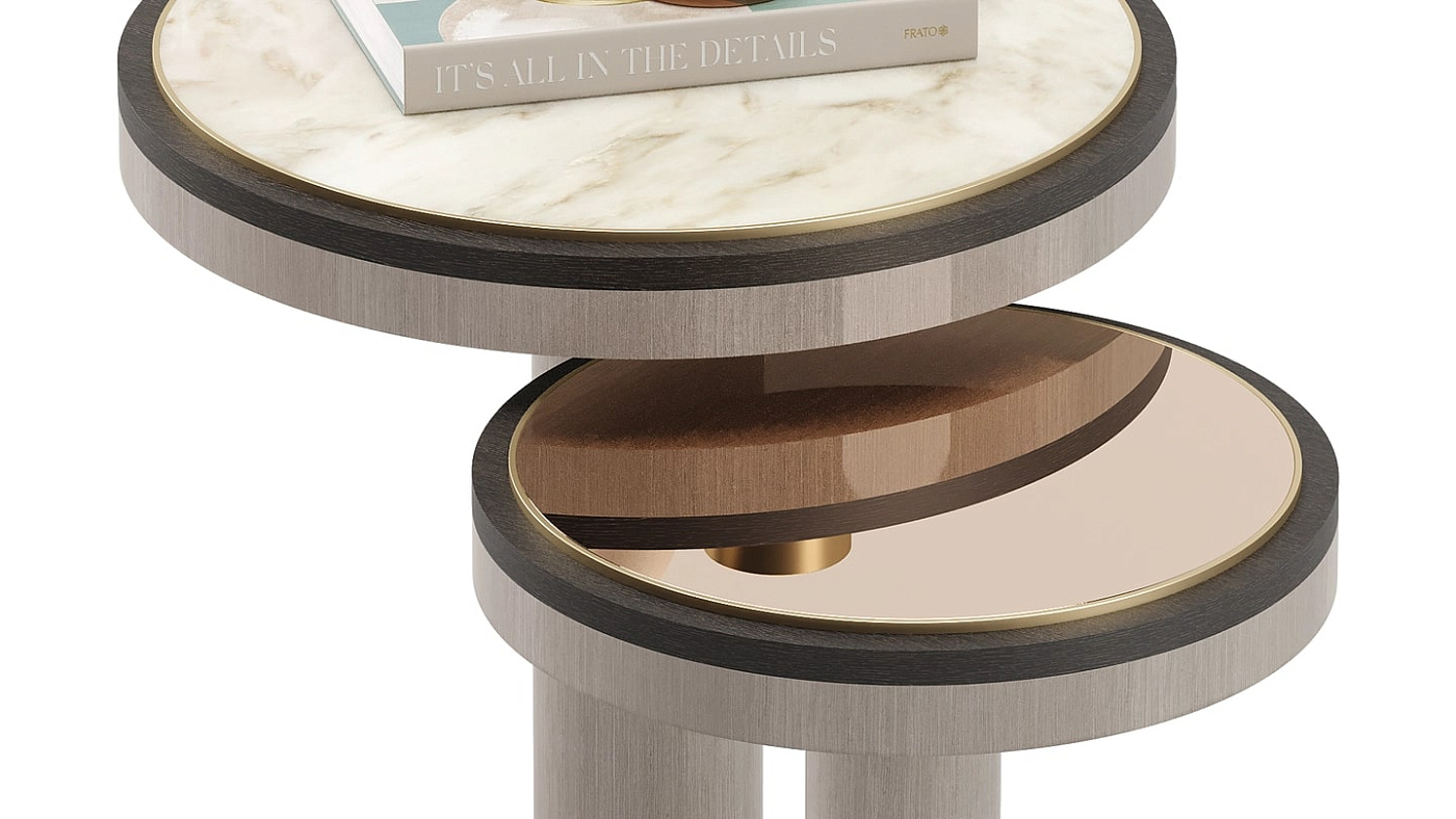 Простая, массивная форма подставки приставного столика CALGARY акцентирует внимание на красоте искусно выполненных многослойных материалов, которые включают камень, матовую латунь и контрастные оттенки деревянного шпона. Поставьте рядом с диваном или используйте в качестве прикроватной тумбочки с урезанной спинкой.