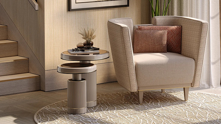 Мы любим использовать материалы неожиданными способами, о чем свидетельствует приставной столик HAMPTONS. Двухобъемный дизайн, зеркальные поверхности, играющие светом и отражениями, и рифленые подставки, придающие текстуру, в то время как вставки из шпона и матовой латуни очерчивают его силуэт.