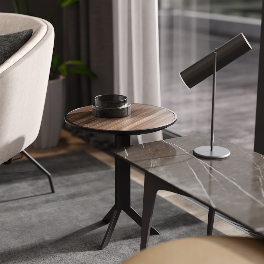 Линии приставного столика Jockey образуются в результате пересечения наклонных металлических ножек и столешницы, выполненной из двух различных материалов, что позволяет объединить визуальную нагрузку шпона пау-ферро с глянцевым лаком, в результате чего получается предмет современного дизайна, который можно легко персонализировать, чтобы он наилучшим образом соответствовал интерьеру комнаты.