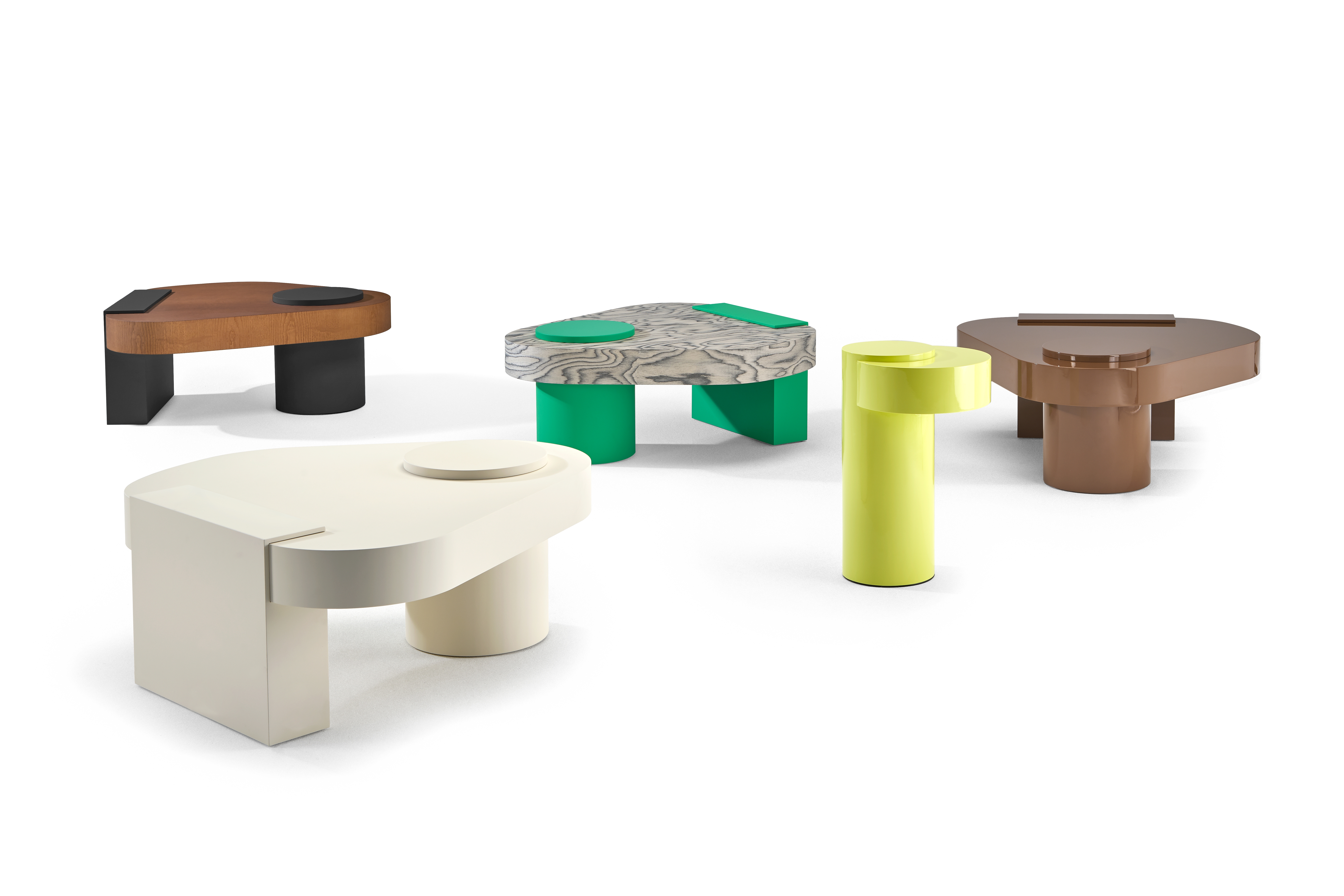 Bold - это стол смелых форм и размеров XL, разработанный студией Studiopepe. Столешница отличается увеличенным профилем и неправильными очертаниями, в то время как из нее выделяются три основные геометрические формы (прямоугольник, круг и треугольник), создавая динамичную визуальную игру, поскольку каждая из них проявляется на своем уровне. Эти элементарные формы на самом деле являются ножками, которые появляются на поверхности, через которую они проходят.