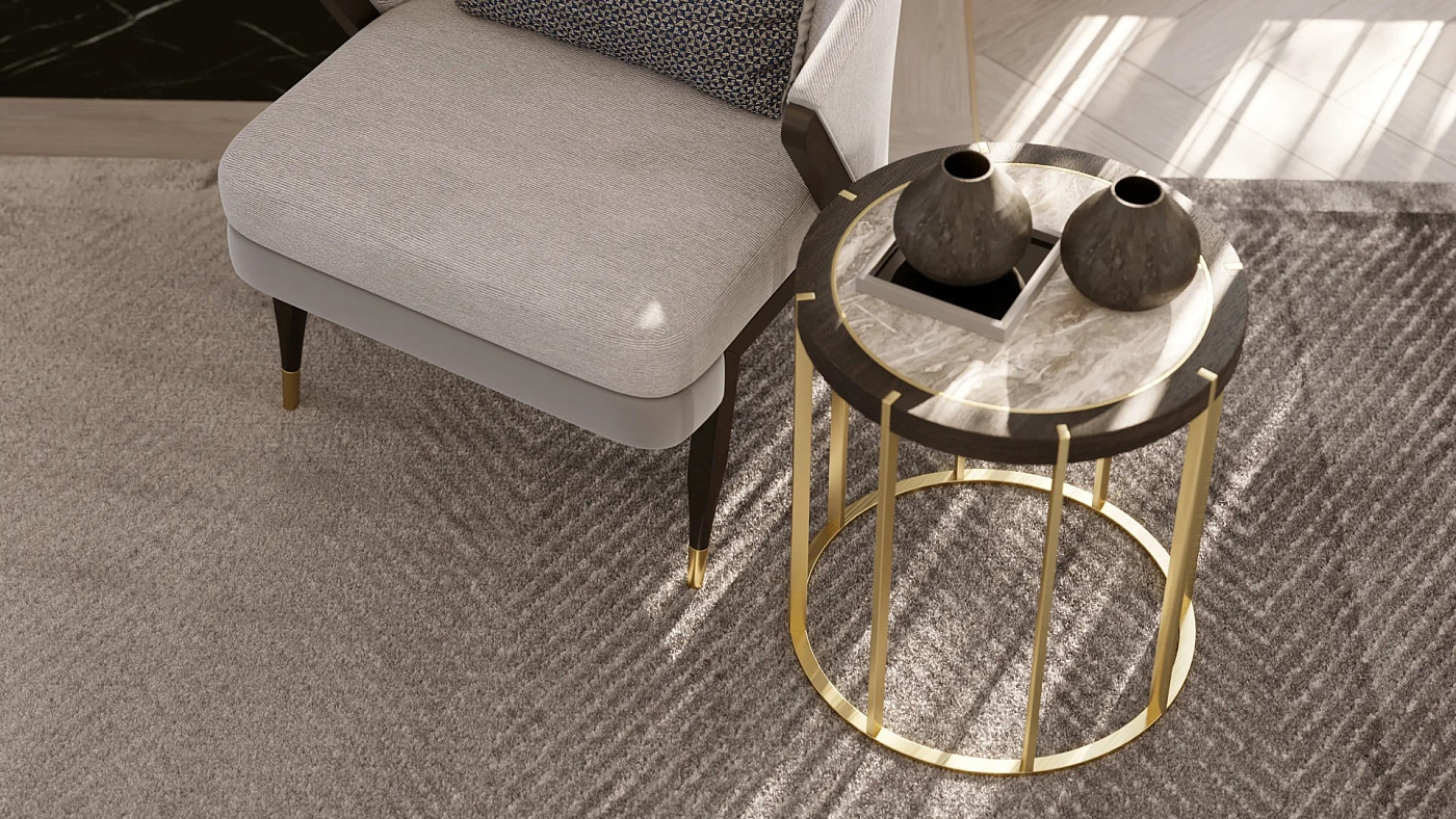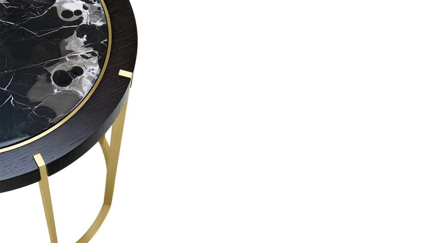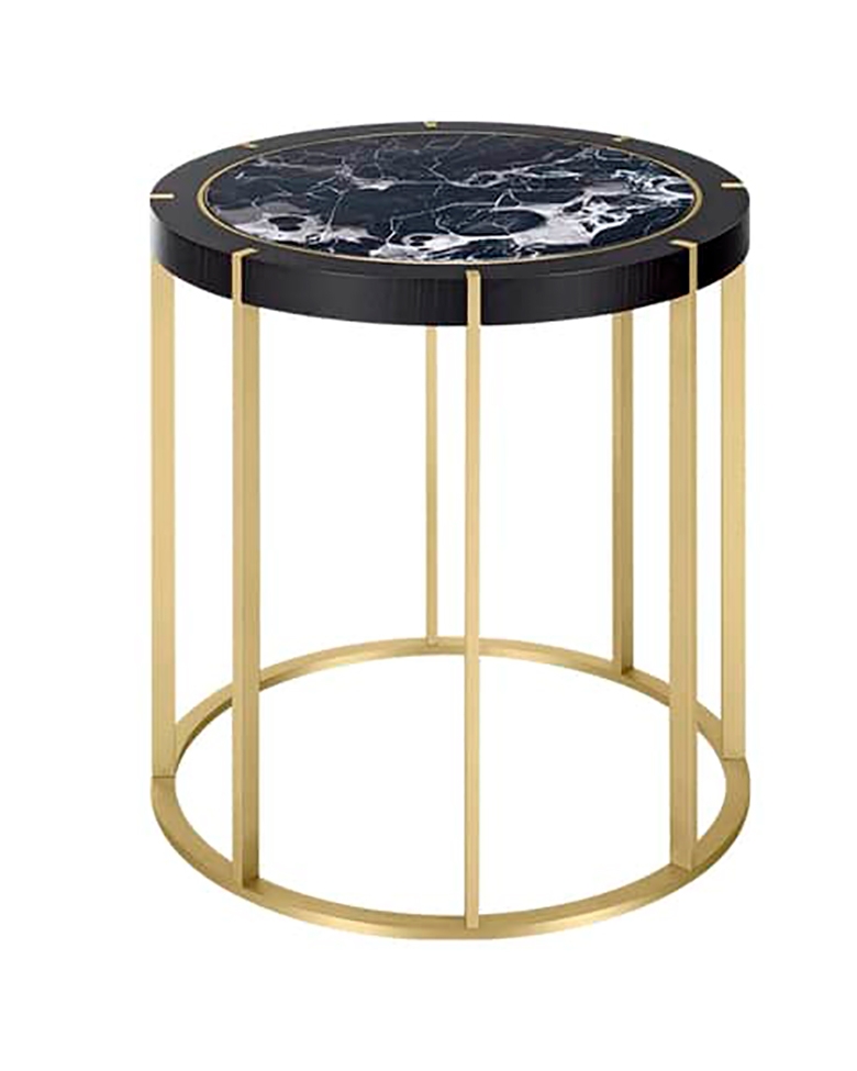 Приставной столик PRAGUE выполнен в форме барабана с круглым металлическим основанием и восемью тонкими ножками. Они прорезают внешние края поверхности, в центре которой находится камень, окруженный кольцами из металла и деревянного шпона.