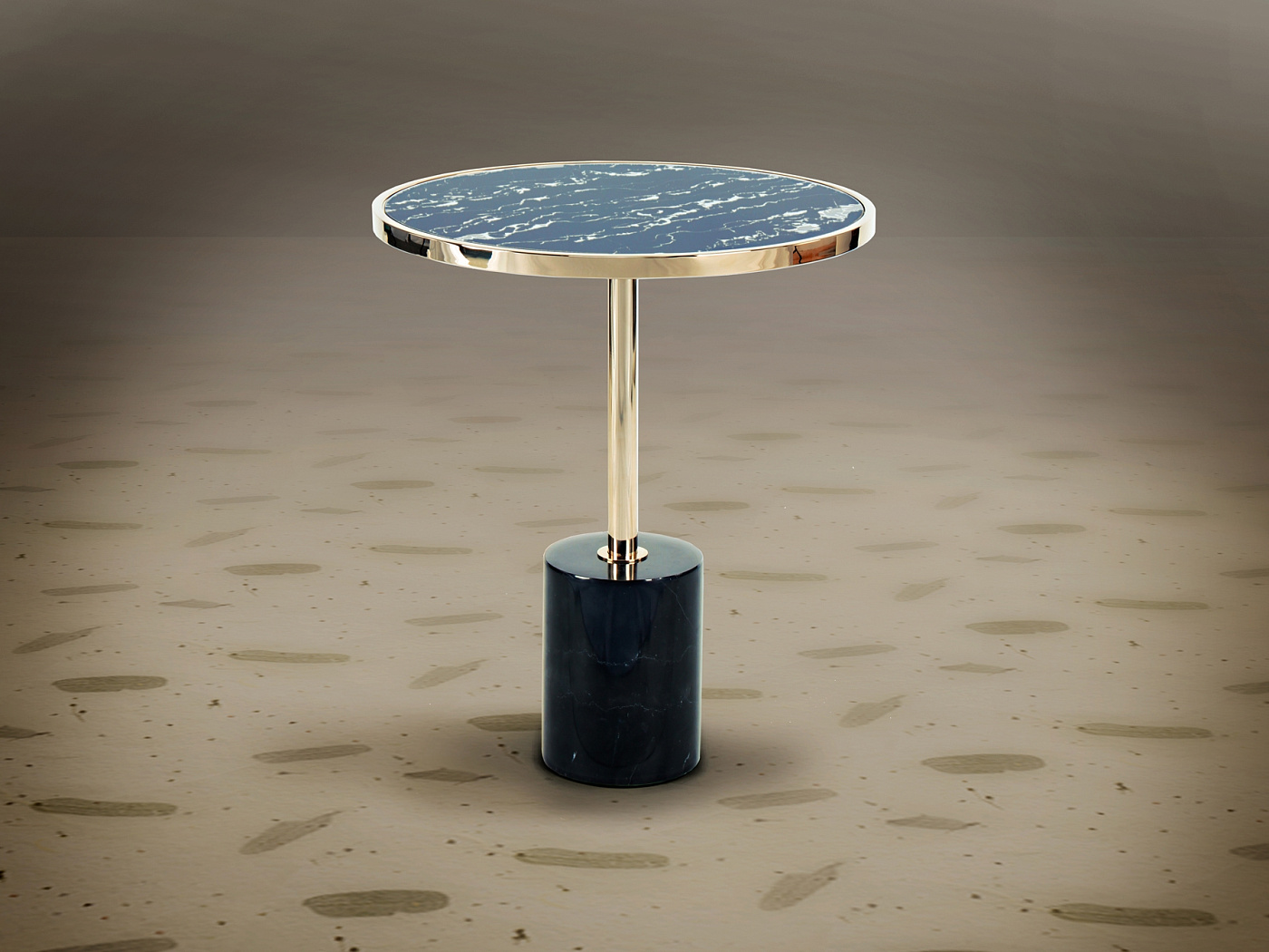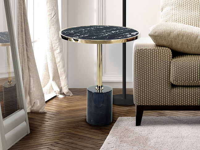 Столик придиванный из нержавеющей стали с золотистым покрытием. Основание черное мраморное и столешница из закаленного стекла с покрытием, имитирующим чёрный мрамор.