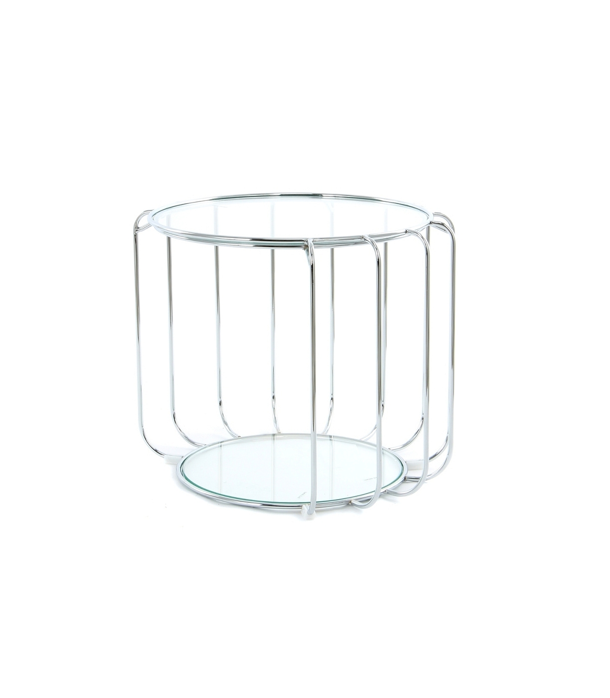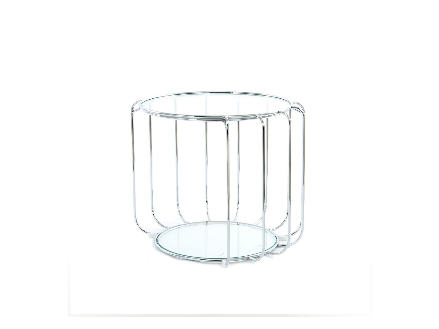 Столик придиванный круглый, из глянцевой стали. Столешница и нижняя полка из закаленного стекла толщиной 6 мм.