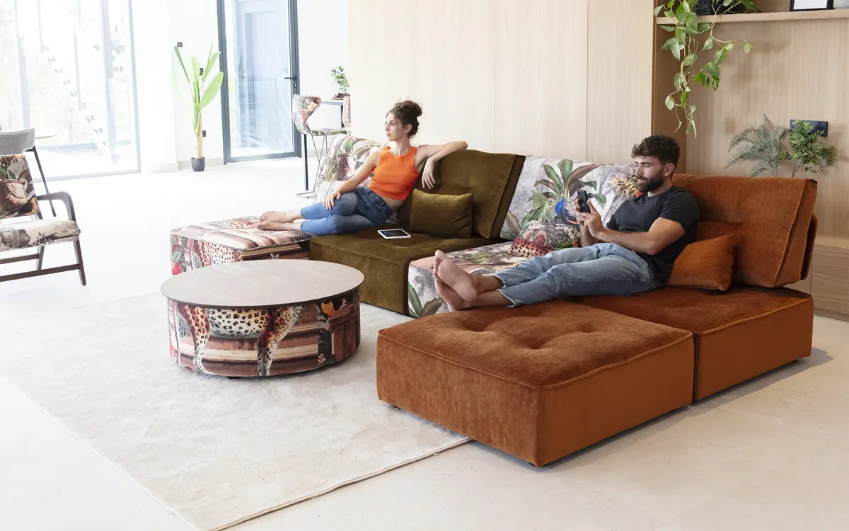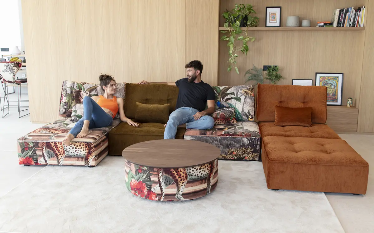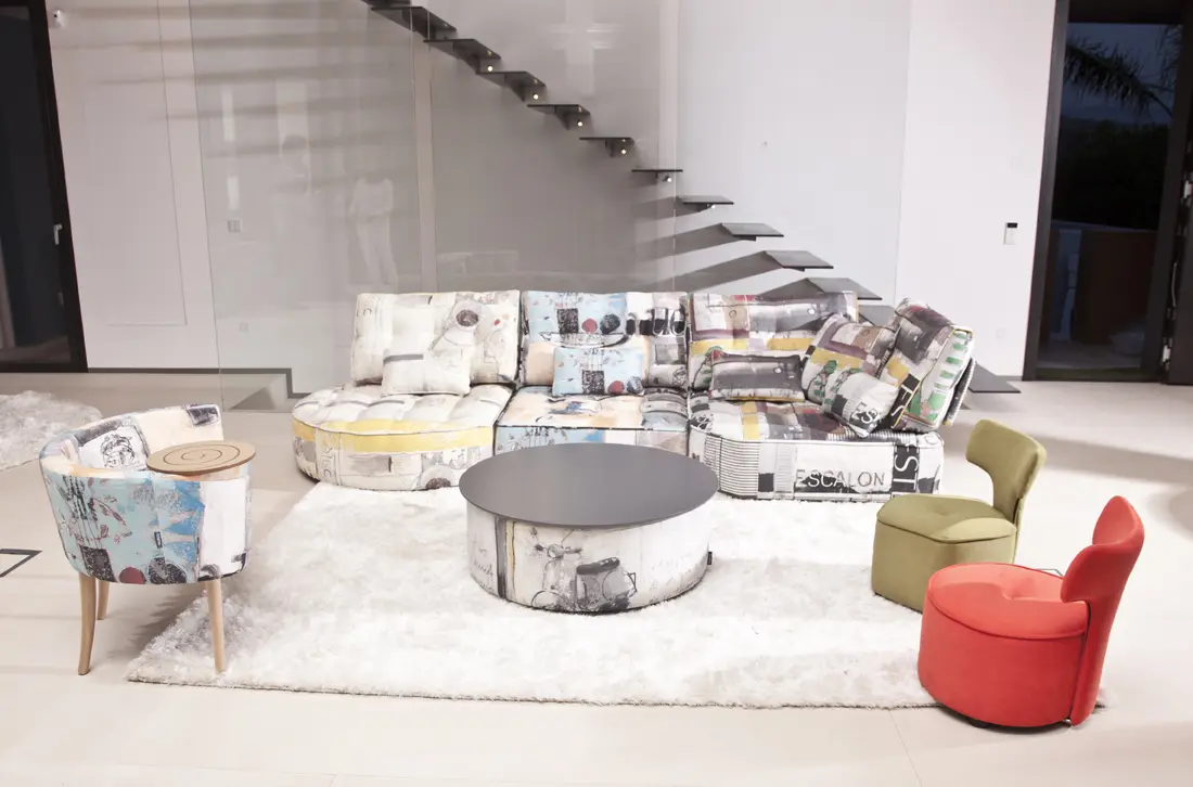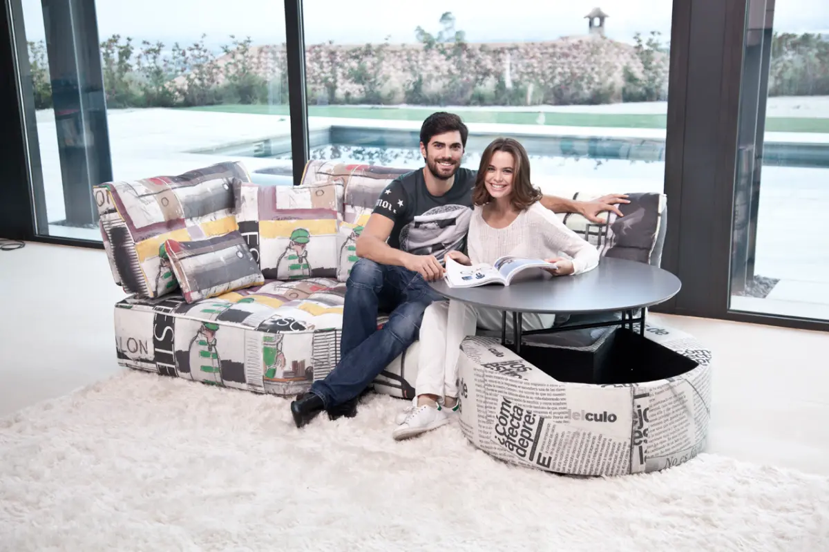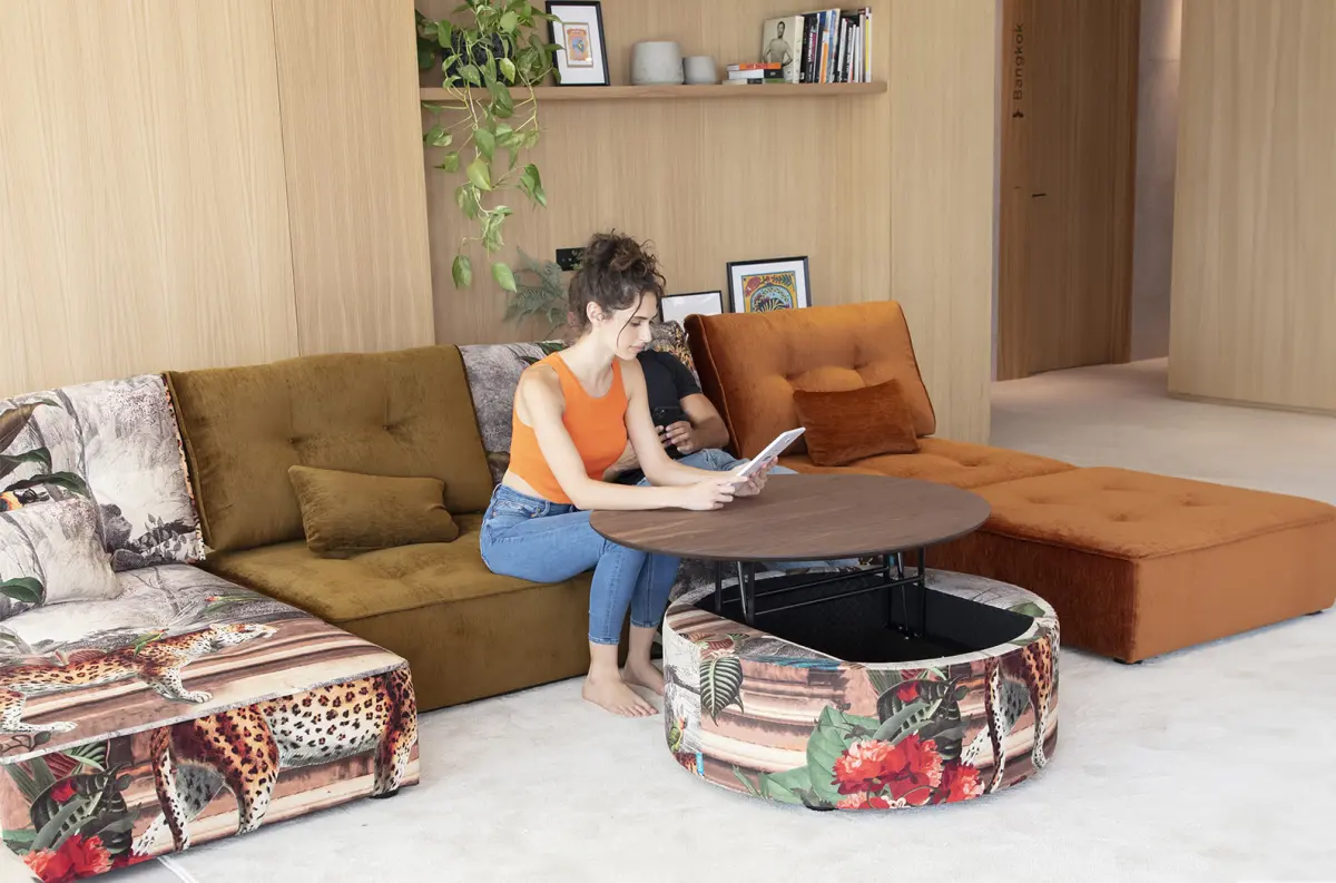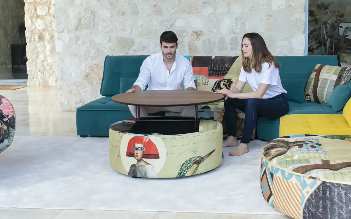 Мягкие столы с подъемной столешницей и ящиком для хранения, которые мы можем подобрать под наш диван или кресло. в форме полумесяца и в форме круга.