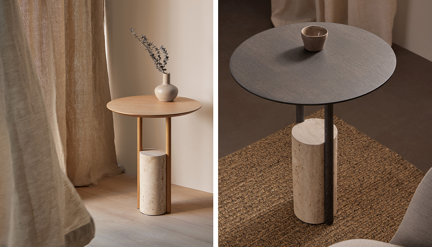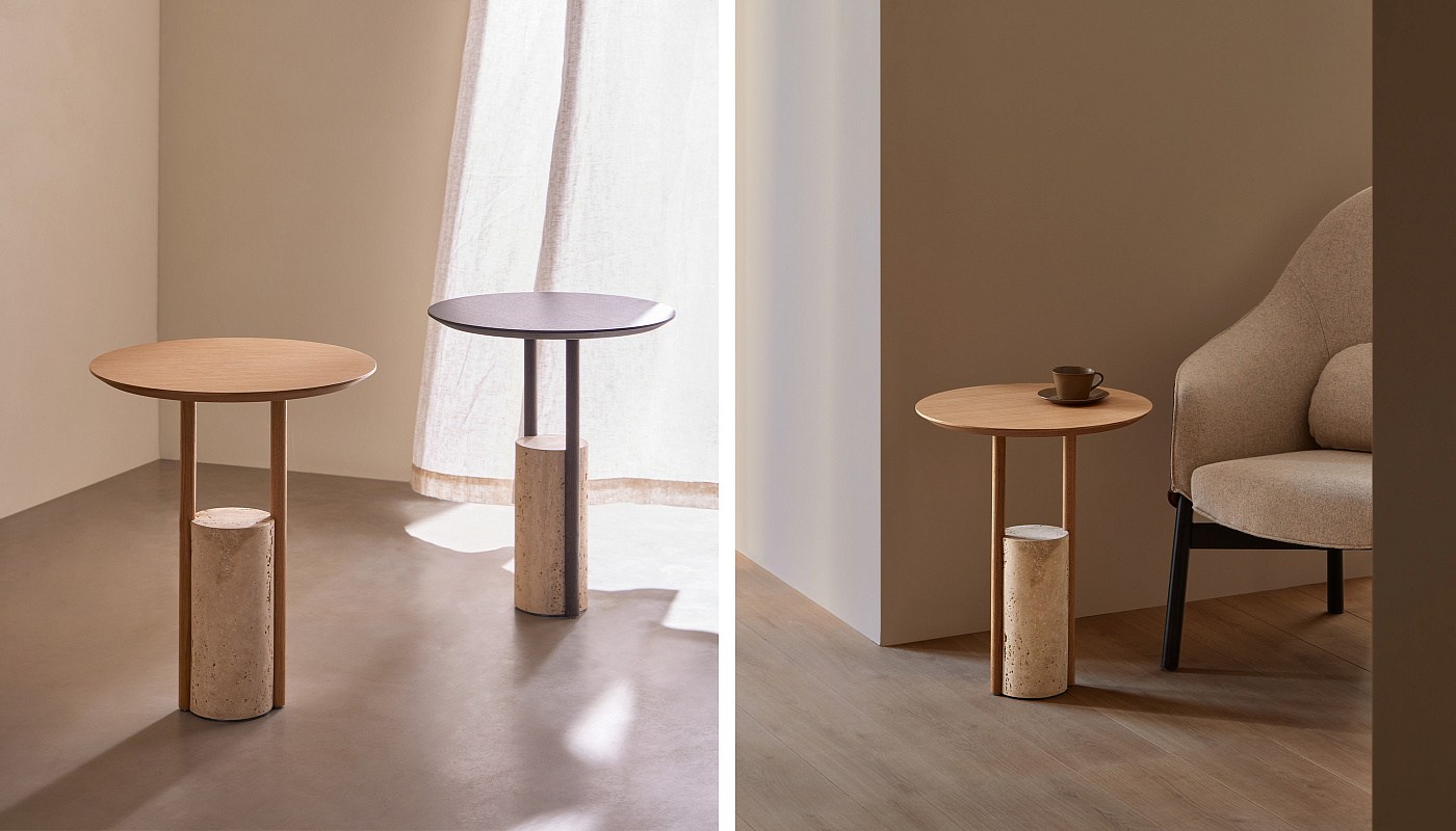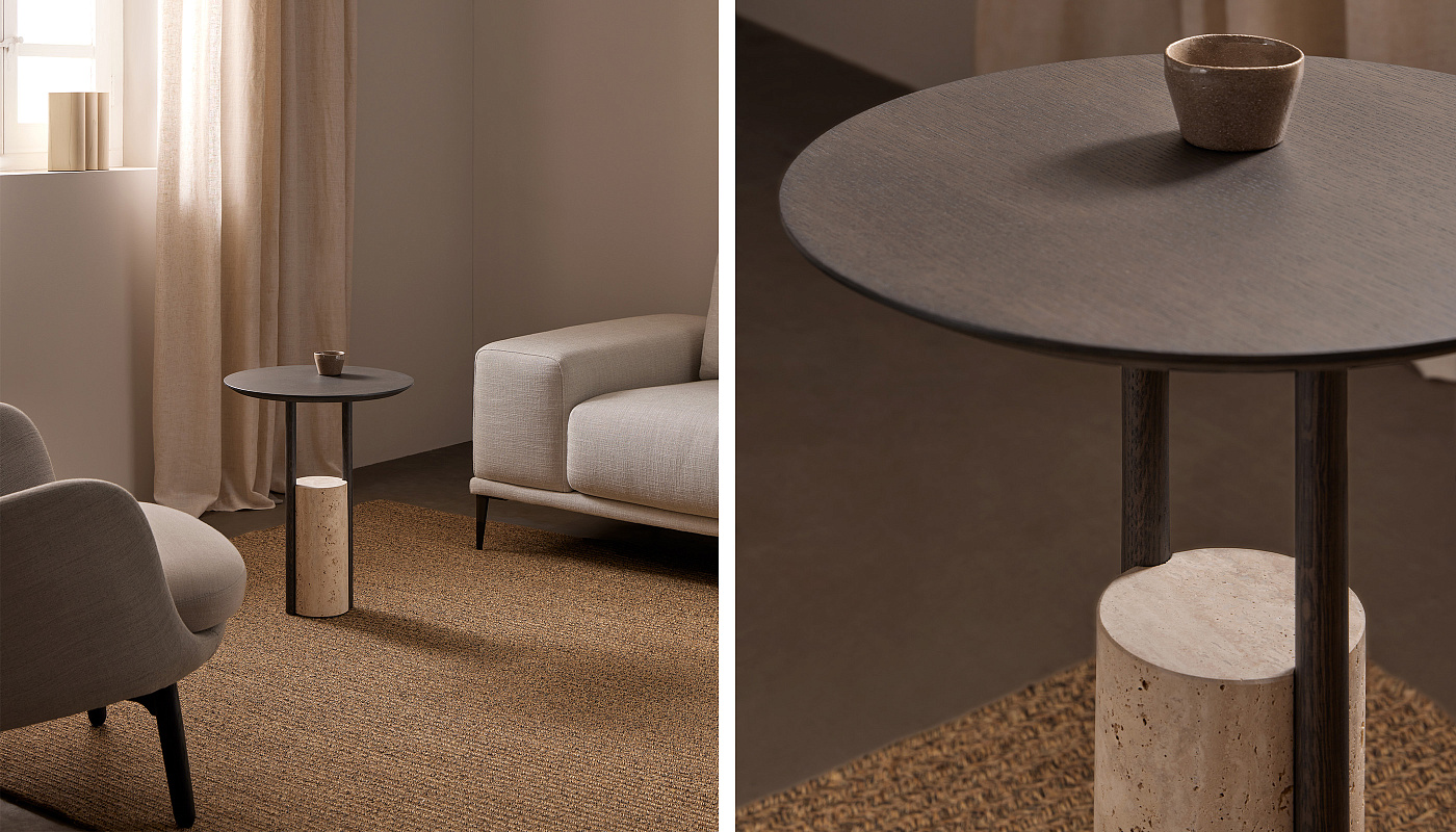 Zanco — это небольшой приставной столик, созданный с простой геометрией, подчеркивающей ценность его материалов. Круглая вершина опирается на две колонны, вставленные по обе стороны цилиндрического основания. Чистота форм и благородство материалов придают столу элегантность и универсальность. Контраст между составляющими его частями придает жизнь столу Zanco. Это контраст, с одной стороны, материалов. Основание представляет собой блок травертинового мрамора , а опоры и основание отделаны дубом . Оба являются натуральными, но очень разными по своим свойствам и внешнему виду. С другой стороны, это контраст пропорций. Объем основания контрастирует с легкостью опор и столешницы, создавая очень сбалансированную эстетику. В основе Zanco лежит простая, но мощная геометрическая фигура: круг. Приставной столик, состоящий из объемного цилиндра, выполняющего роль основания, и двух легких цилиндров, поддерживающих круглую столешницу.