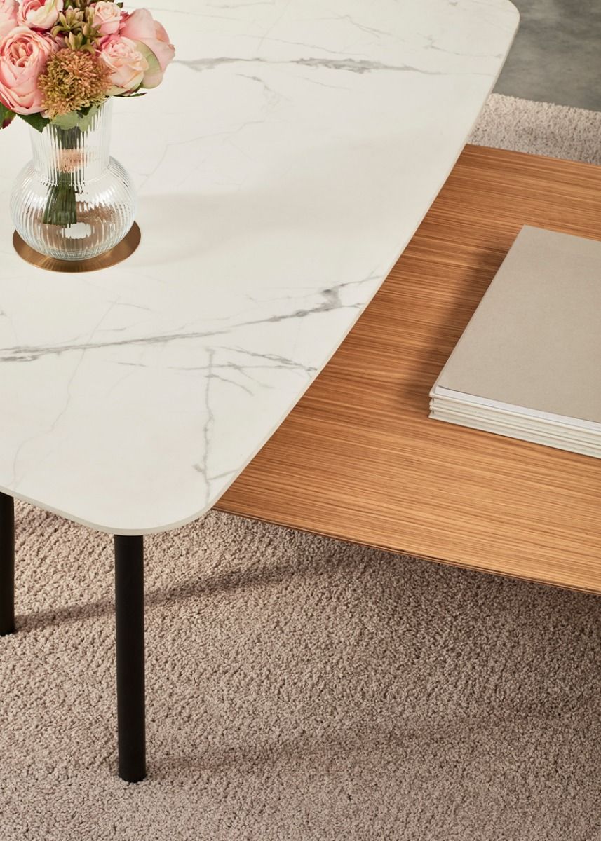 Журнальный столик выполненный из разных материалов, входящий в коллекцию Insula, вместе с набором модульных диванов, которые основаны на комбинации 2 длин сидений (коротких и длинных) и 3 размеров спинки (A, B & C), с разными формами и размерами столов.