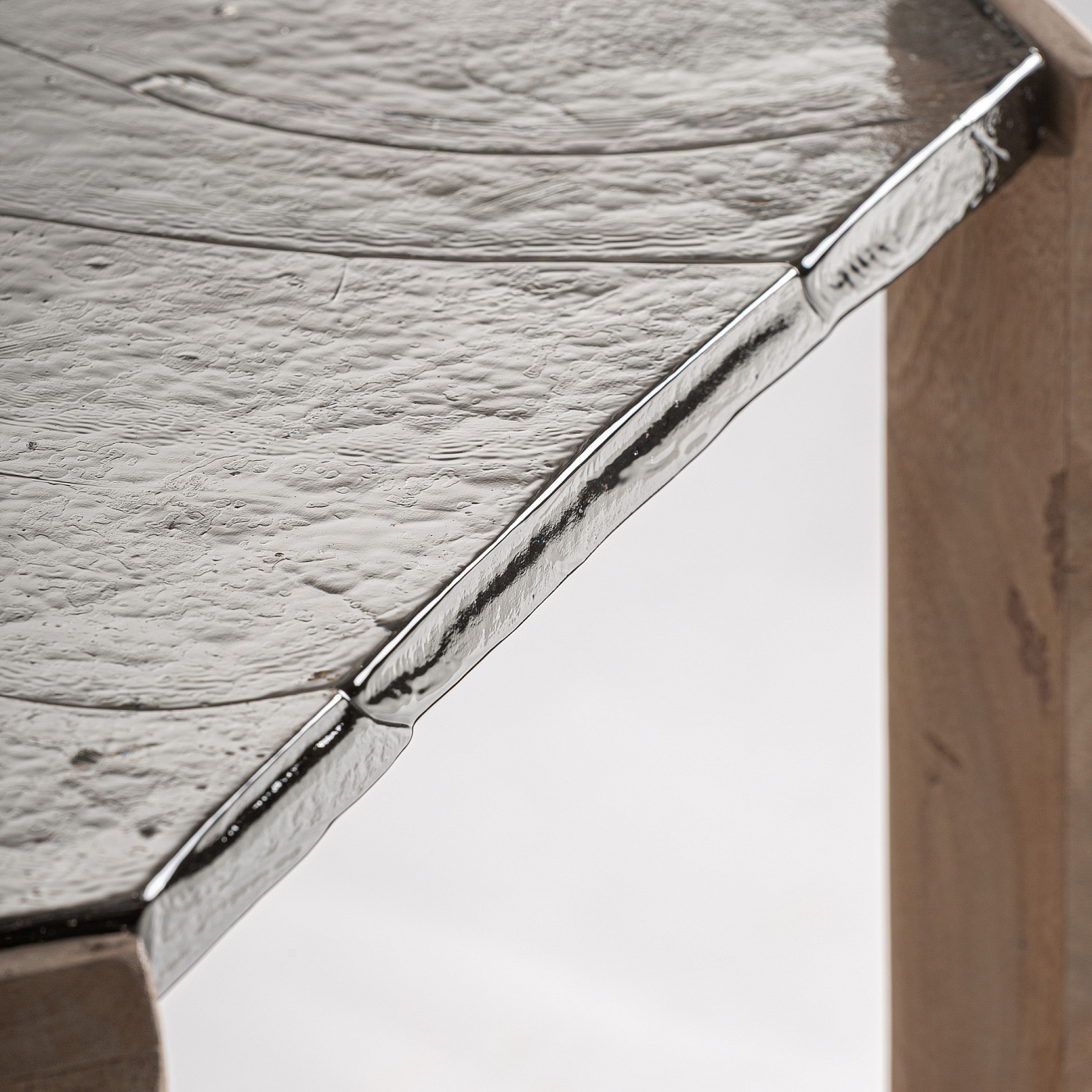 журнальный столик в современном стиле. Изготовлен из древесины манго коричневого цвета в сочетании со стеклом прозрачного цвета. Ширина: 90 см, Глубина: 90 см, Высота: 40 см