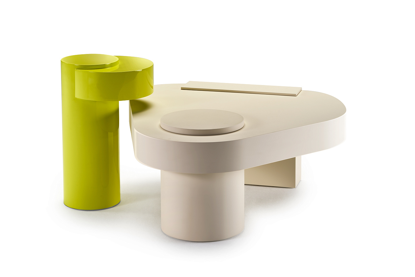 Bold - это стол смелых форм и размеров XL, разработанный студией Studiopepe. Столешница отличается увеличенным профилем и неправильными очертаниями, в то время как из нее выделяются три основные геометрические формы (прямоугольник, круг и треугольник), создавая динамичную визуальную игру, поскольку каждая из них проявляется на своем уровне. Эти элементарные формы на самом деле являются ножками, которые появляются на поверхности, через которую они проходят.