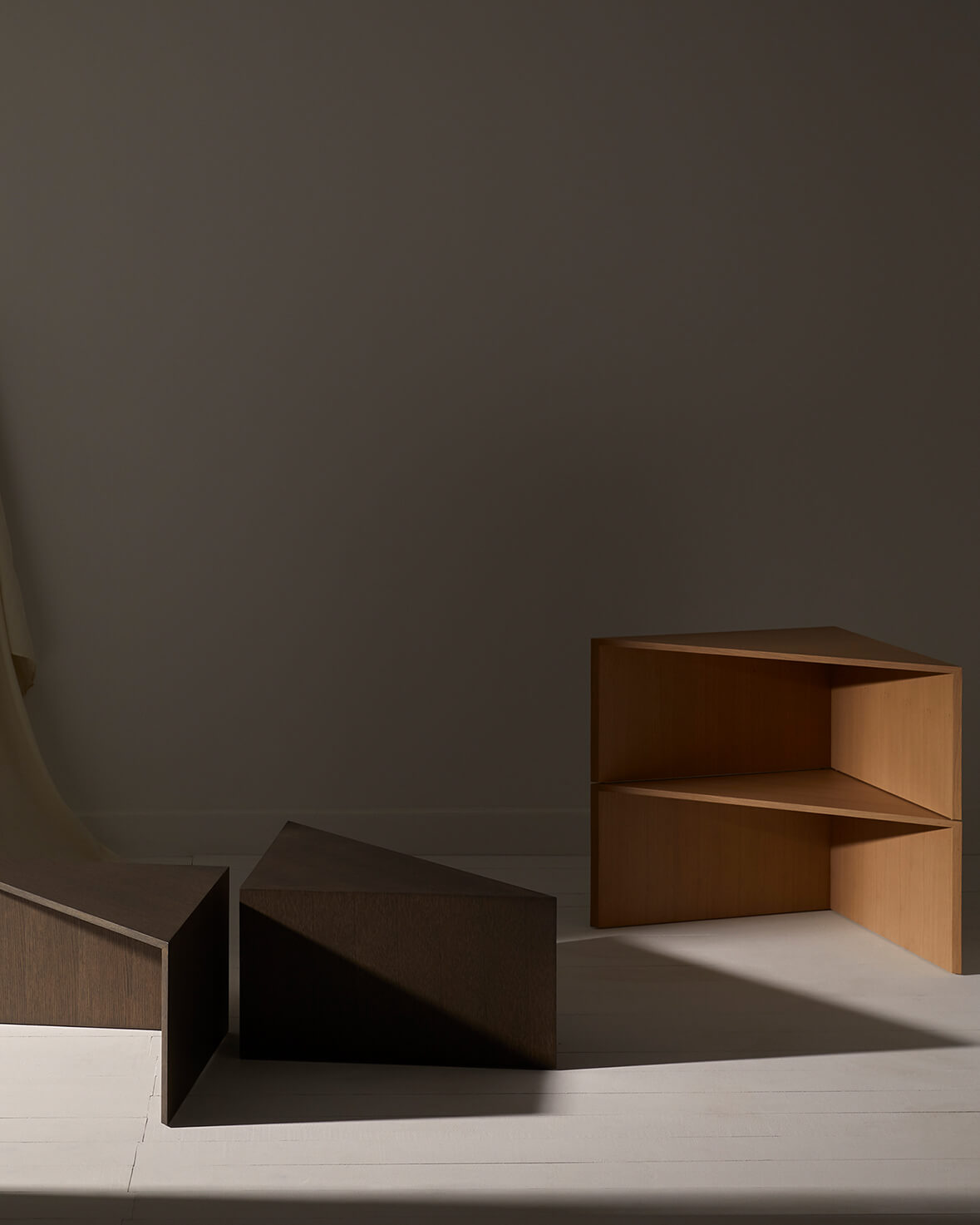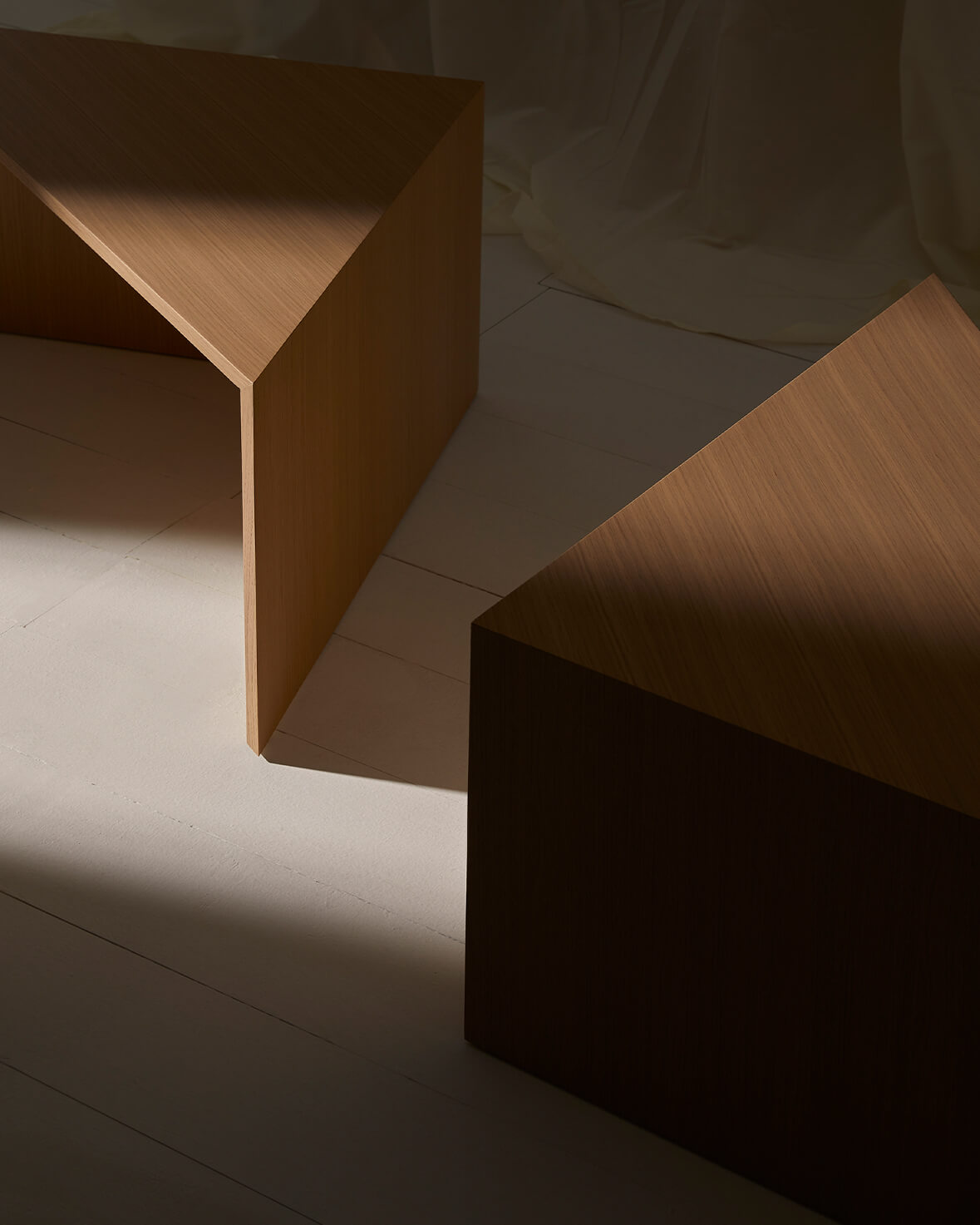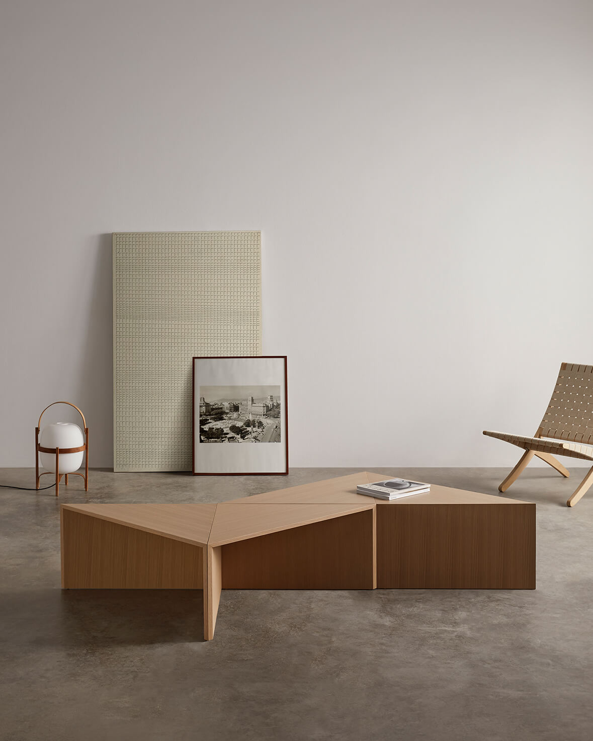 Стол состоит из четырех треугольных модулей, которые работают как вместе, так и по отдельности, выполняя функцию журнального столика, приставных столиков или вспомогательных надстроек для удовлетворения потребностей каждой среды. Это неподвластный времени дизайн с превосходными пропорциями, которые создают уникальное и индивидуальное пространство благодаря множеству комбинаций его деталей и различной отделке из дуба и лака.