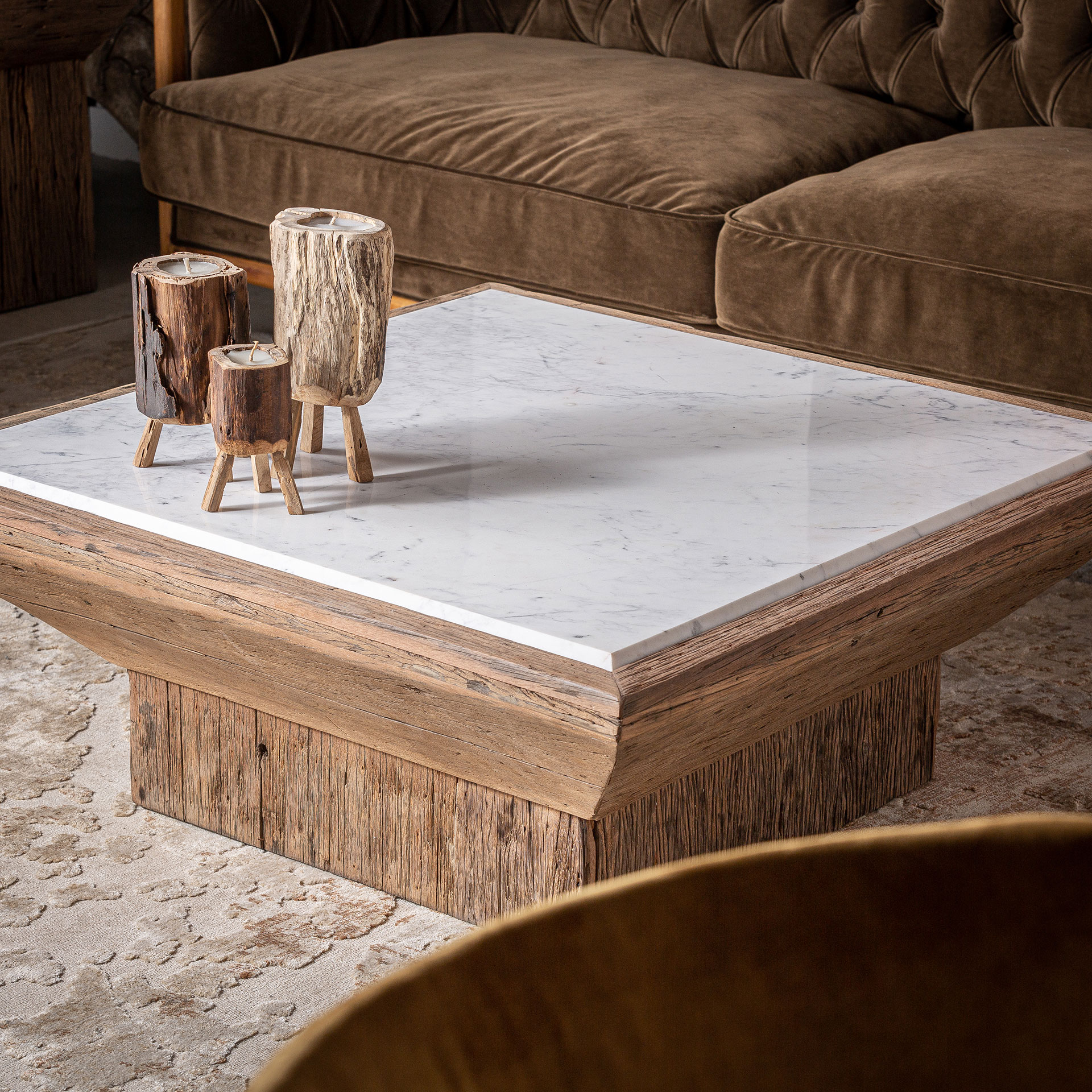 Журнальный столик Samsung, цвет натуральный/состаренный белый, в этническом стиле. Изготовлен из переработанной сосновой древесины в сочетании с мрамором. Различные породы дерева: сосна, манго, тик, акация.