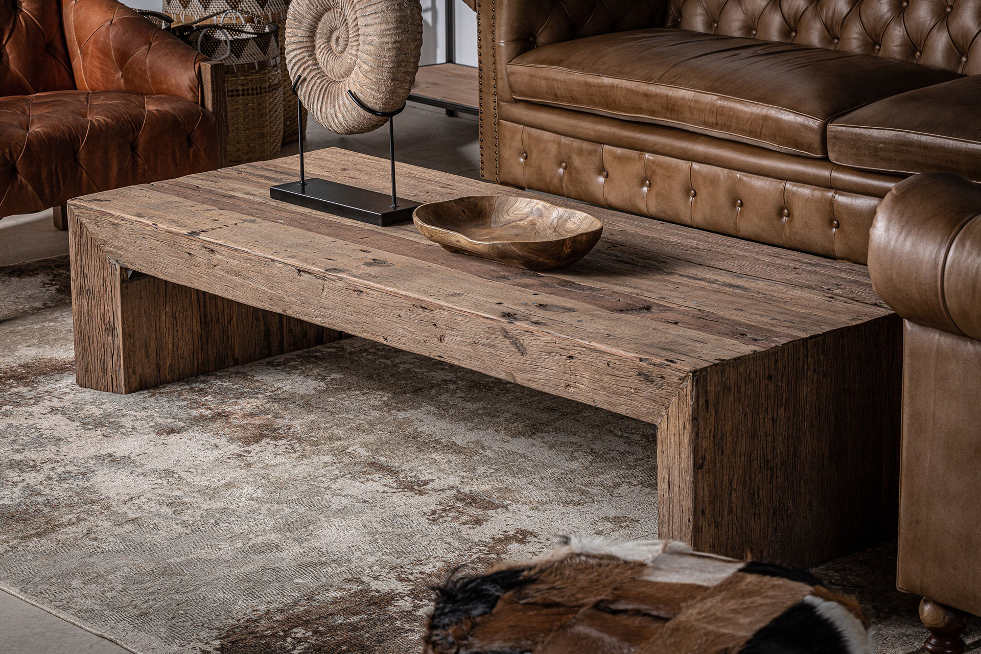 Журнальный столик Samsung, состаренного натурального цвета, в этническом стиле. Изготовлен из переработанной сосновой древесины. Различные породы дерева: сосна, манго, тик, акация.