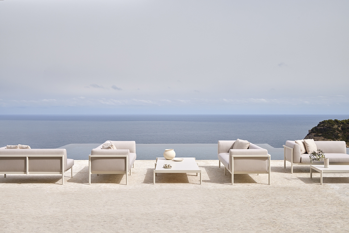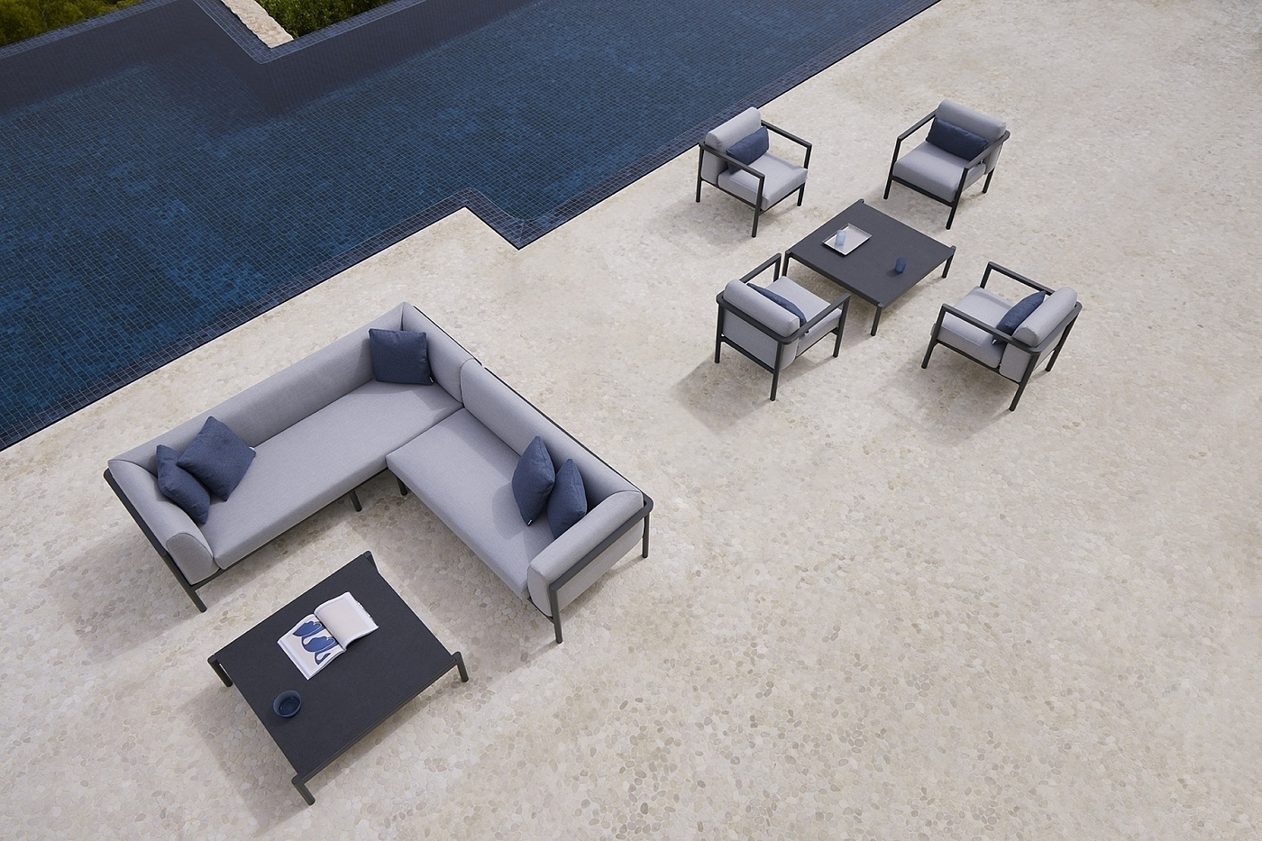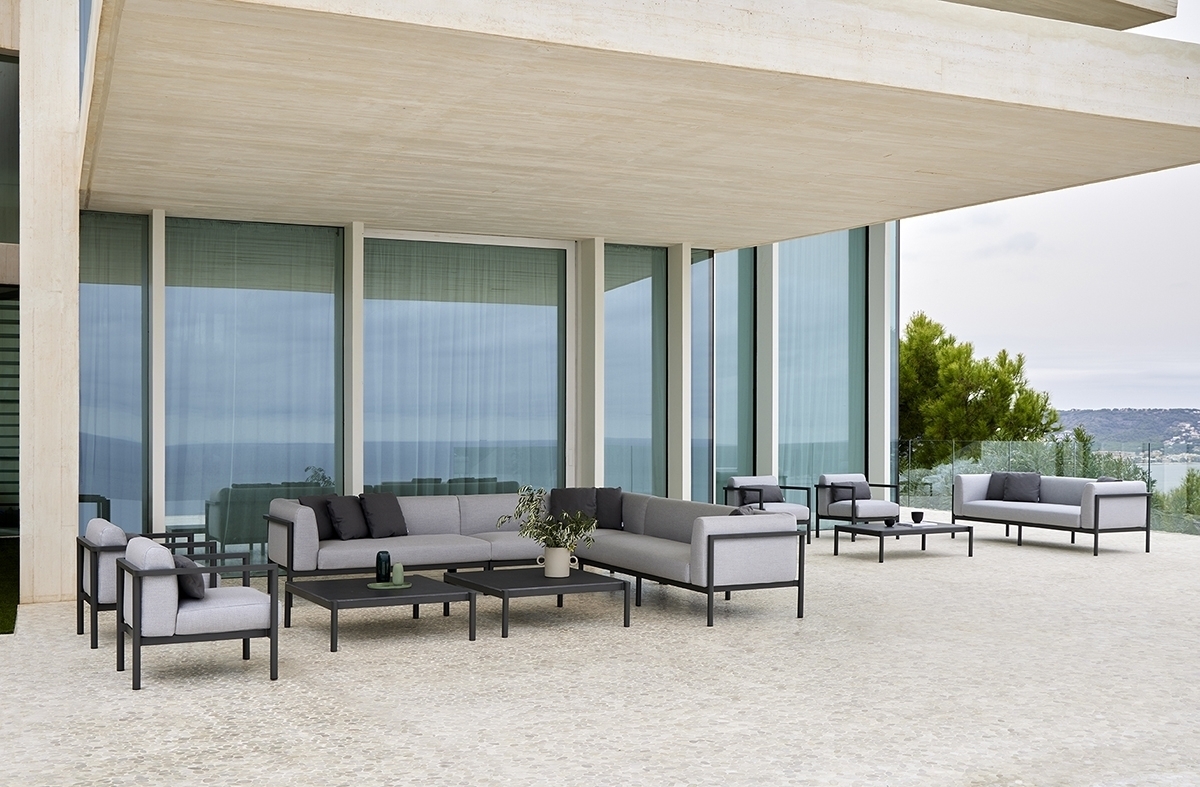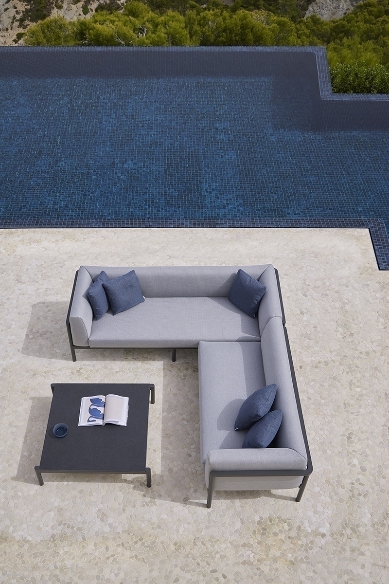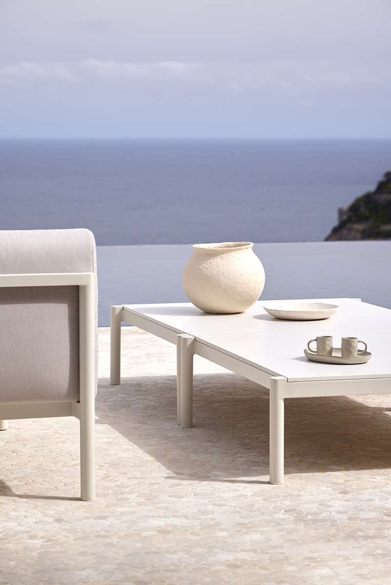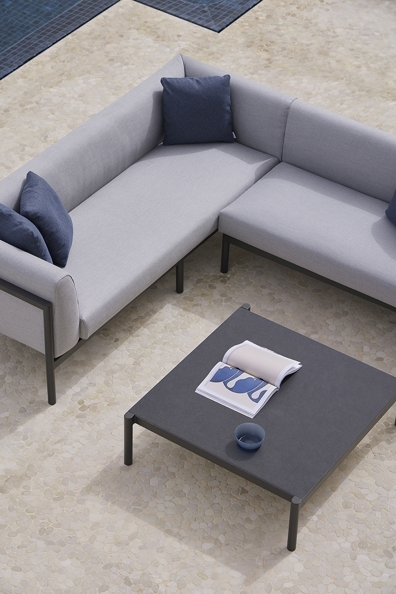 Квадратный журнальный столик. Алюминиевая конструкция с порошковым покрытием доступна в кремовом цвете 34 и сером цвете 56. Верхняя часть из алюминия, фарфора или компакта. Фарфоровые цвета: натуральный белый 81, серая лава 82, серый базальт 86, серая охра 87 и белый мрамор 85. Компактные цвета: бежевый, черный, одинарный белый, одинарный серо-коричневый, белый мрамор и дерево.