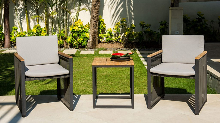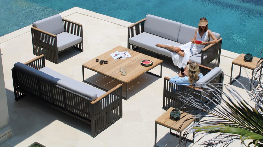 Одна из последних разработок в нашем новом каталоге. Сочетание черного алюминия, темно-серых ремешков и подлокотников из тикового дерева создает универсальную коллекцию, идеально подходящую как городским экстерьерам, так и пространствам для отдыха.