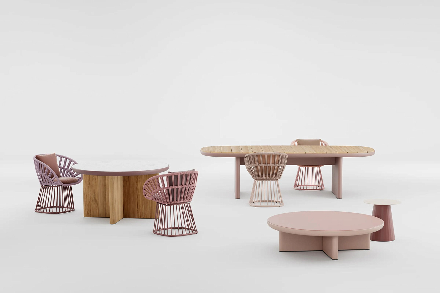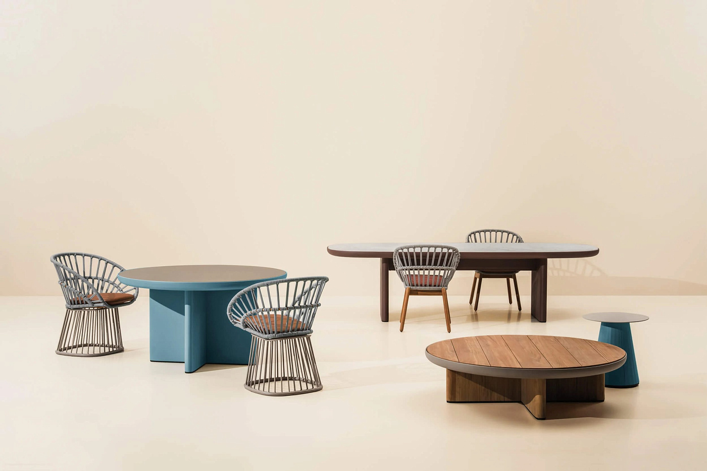Cala’ - это кресло с высокой спинкой, вдохновленное культовым Эммануэль. Кресло обладает величественным пространственным присутствием благодаря прозрачным и светлым поверхностям. Открытое переплетение веревки создает решетчатое окно для визуальной приватности, сохраняя при этом связь с природными элементами. "Кала" может использоваться как для обедов на открытом воздухе, так и в качестве кресла для отдыха . Широкий выбор металлических покрытий, цветов канатов и тканей для подушек открывает множество возможностей для придания индивидуальности креслу в соответствии с различными проектами. Каркас сиденья Cala изготовлен из алюминиевых профилей с покрытием. Плетение представляет собой завязанную узлом веревку. Стул поставляется с двумя вариантами ножек из тикового дерева или алюминиевой подставкой-основанием. Коллекция Cala включает в себя обеденный стул, серию столов, низкие скамеечки для ног, двух- и трехместный диван. Обеденный стол имеет монолитный и смелый вид, создавая контраст с легкостью стульев. Такую же каркасную конструкцию можно распознать в низких столиках и скамеечках для ног.
