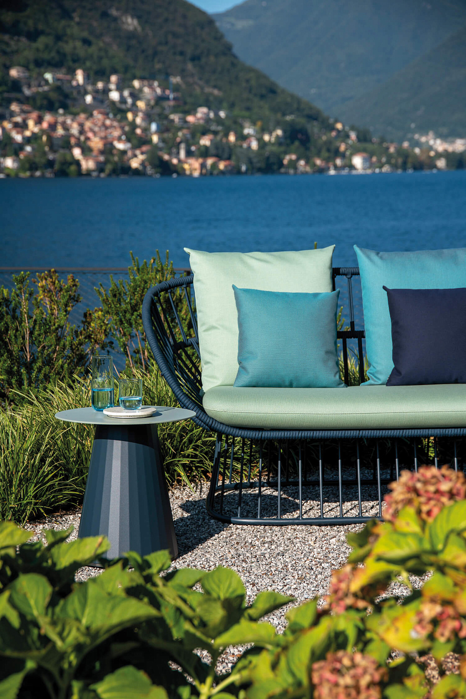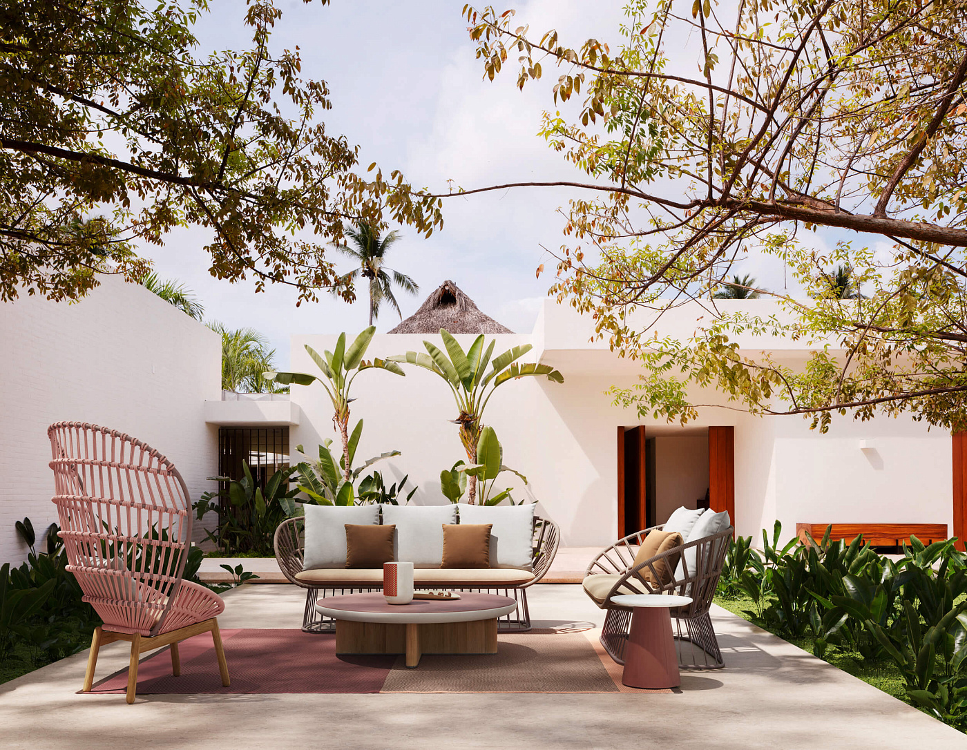 Cala’ - это кресло с высокой спинкой, вдохновленное культовым Эммануэль. Кресло обладает величественным пространственным присутствием благодаря прозрачным и светлым поверхностям. Открытое переплетение веревки создает решетчатое окно для визуальной приватности, сохраняя при этом связь с природными элементами. "Кала" может использоваться как для обедов на открытом воздухе, так и в качестве кресла для отдыха . Широкий выбор металлических покрытий, цветов канатов и тканей для подушек открывает множество возможностей для придания индивидуальности креслу в соответствии с различными проектами. Каркас сиденья Cala изготовлен из алюминиевых профилей с покрытием. Плетение представляет собой завязанную узлом веревку. Стул поставляется с двумя вариантами ножек из тикового дерева или алюминиевой подставкой-основанием. Коллекция Cala включает в себя обеденный стул, серию столов, низкие скамеечки для ног, двух- и трехместный диван. Обеденный стол имеет монолитный и смелый вид, создавая контраст с легкостью стульев. Такую же каркасную конструкцию можно распознать в низких столиках и скамеечках для ног.