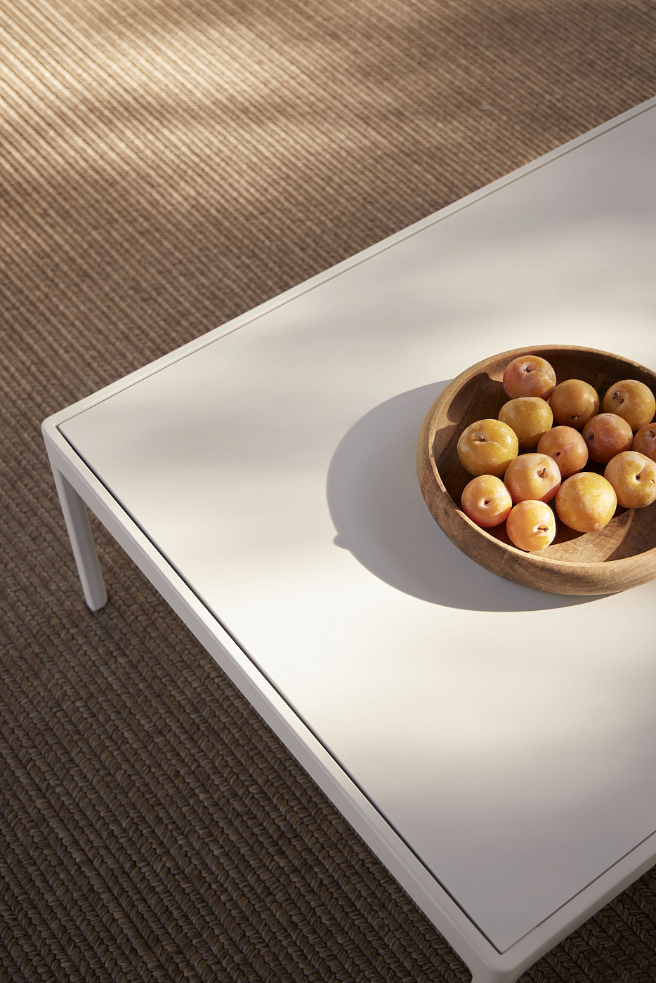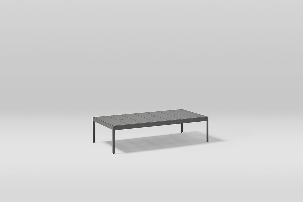 Прямоугольный журнальный столик. Алюминиевая рама с порошковым покрытием доступна в цвете «Минеральный белый 34» и «Серый 56». Столешница из алюминия, фарфора или компактного цвета. Цвета фарфора: натуральный белый 81, серая лава 82, серый базальт 86, серая охра 87 и мраморно-белый 85. Компактные цвета: бежевый, черный, одинарный белый, одинарный серо-коричневый, мраморный белый и дерево. Регулируемые ножки.