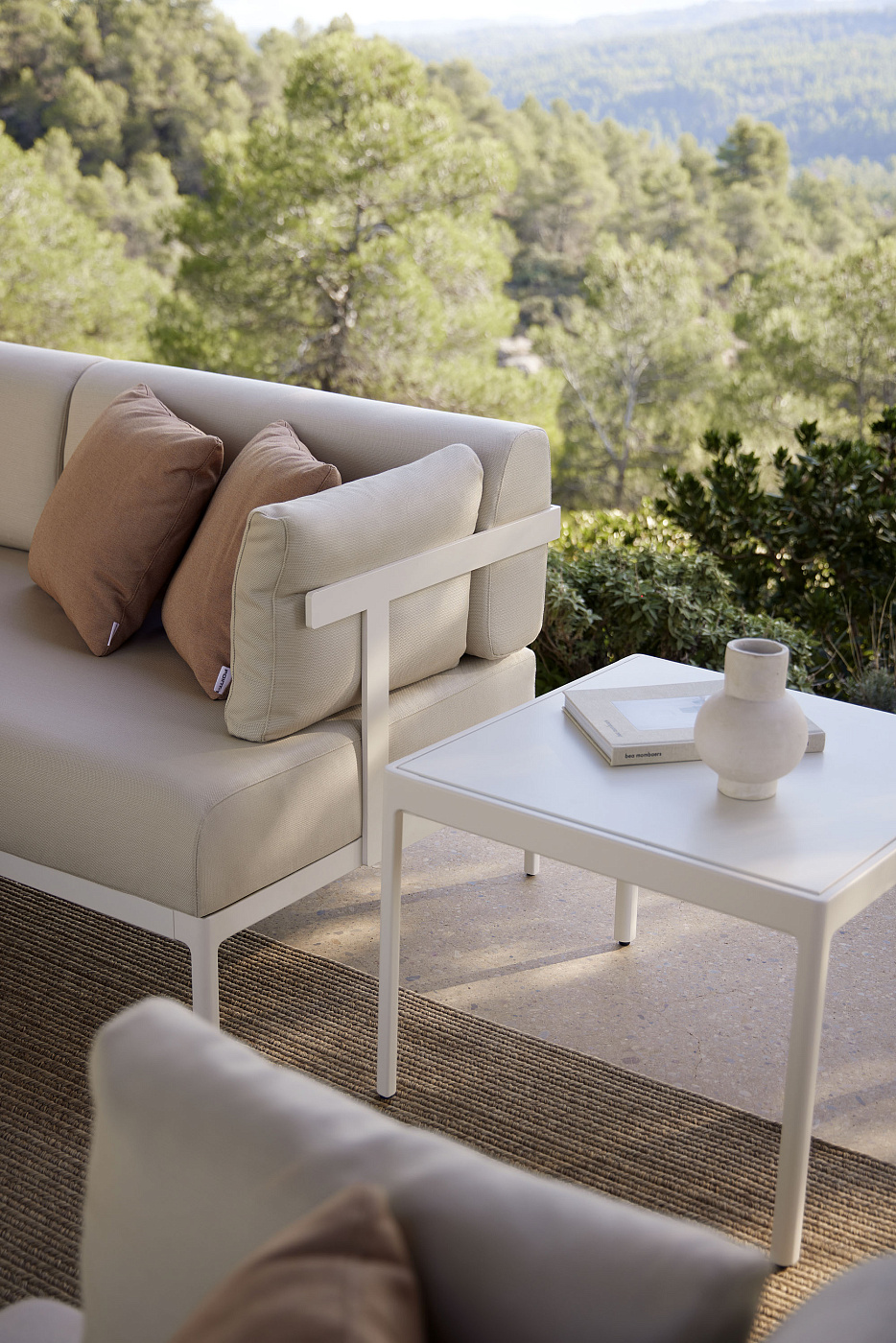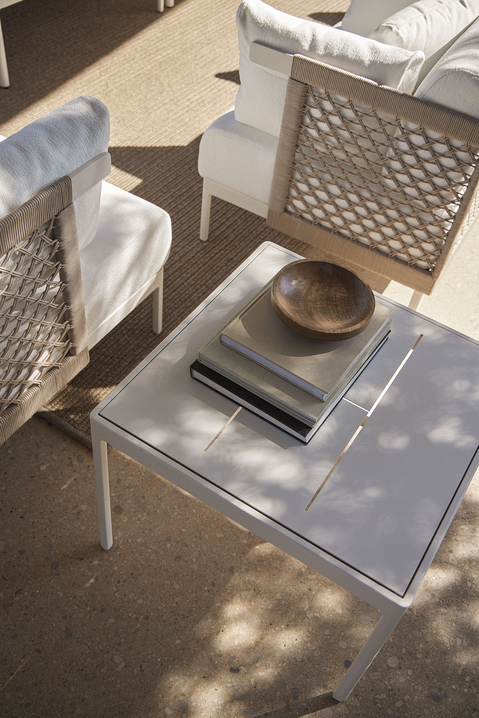 Квадратный столик. Алюминиевая рама с порошковым покрытием доступна в цвете «Минеральный белый 34» и «Серый 56». Столешница из алюминия, фарфора или компактного цвета. Цвета фарфора: натуральный белый 81, серая лава 82, серый базальт 86, серая охра 87 и мраморно-белый 85. Компактные цвета: бежевый, черный, одинарный белый, одинарный серо-коричневый, мраморный белый и дерево. Регулируемые ножки.